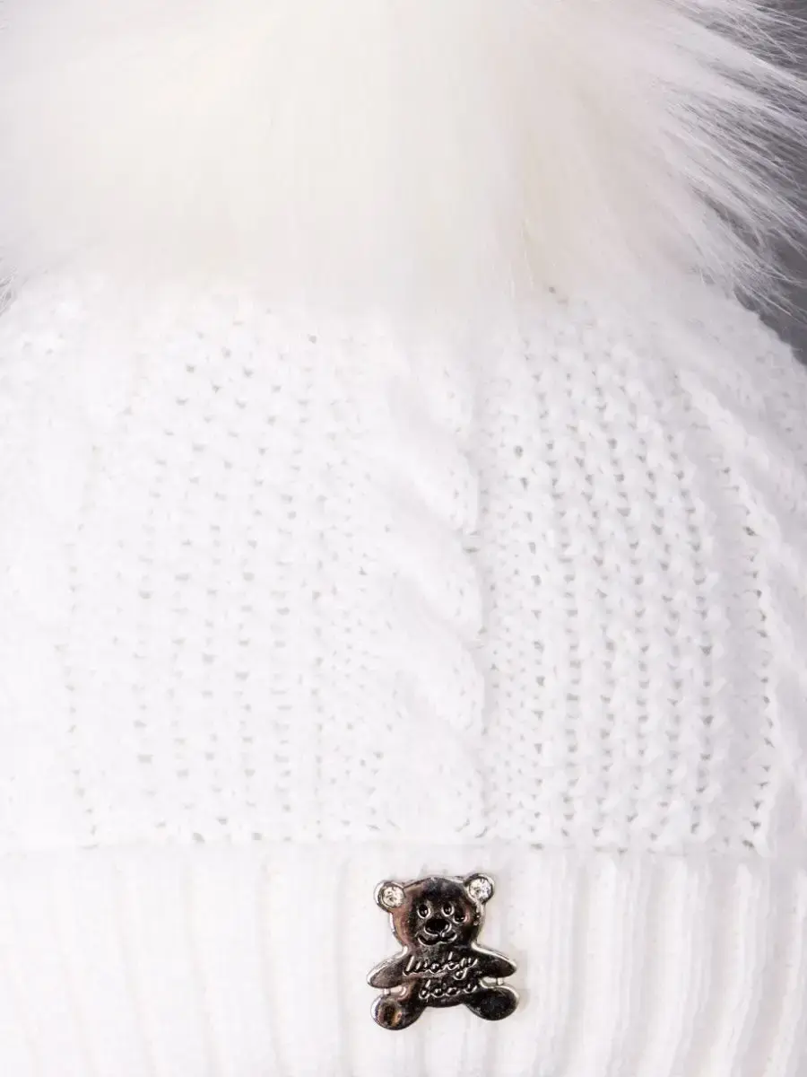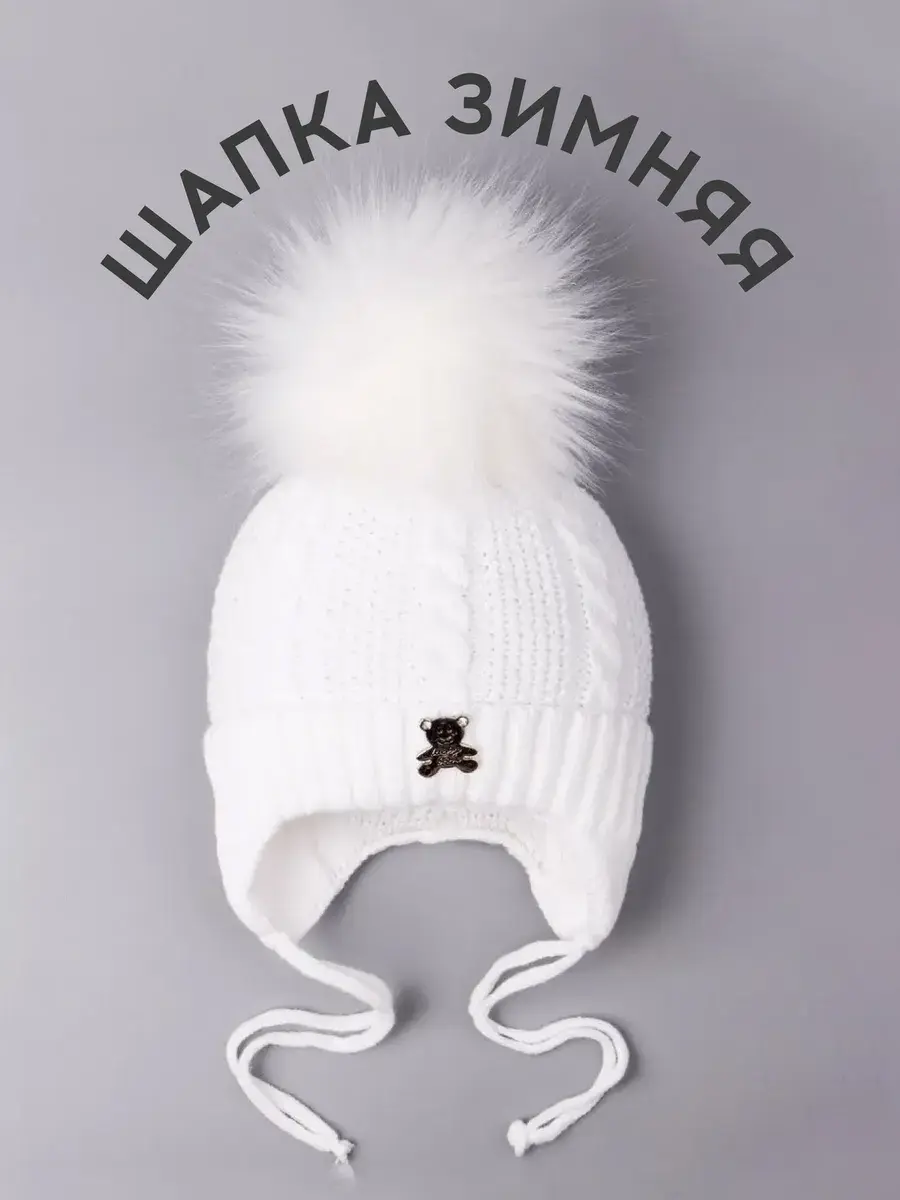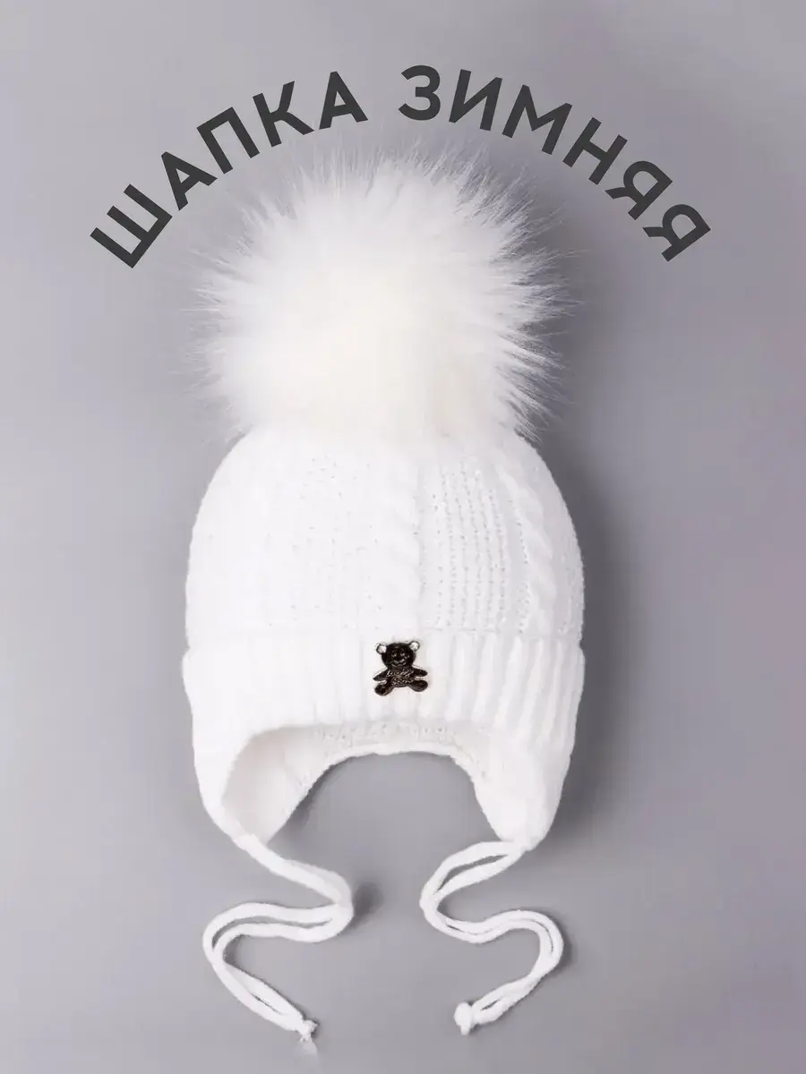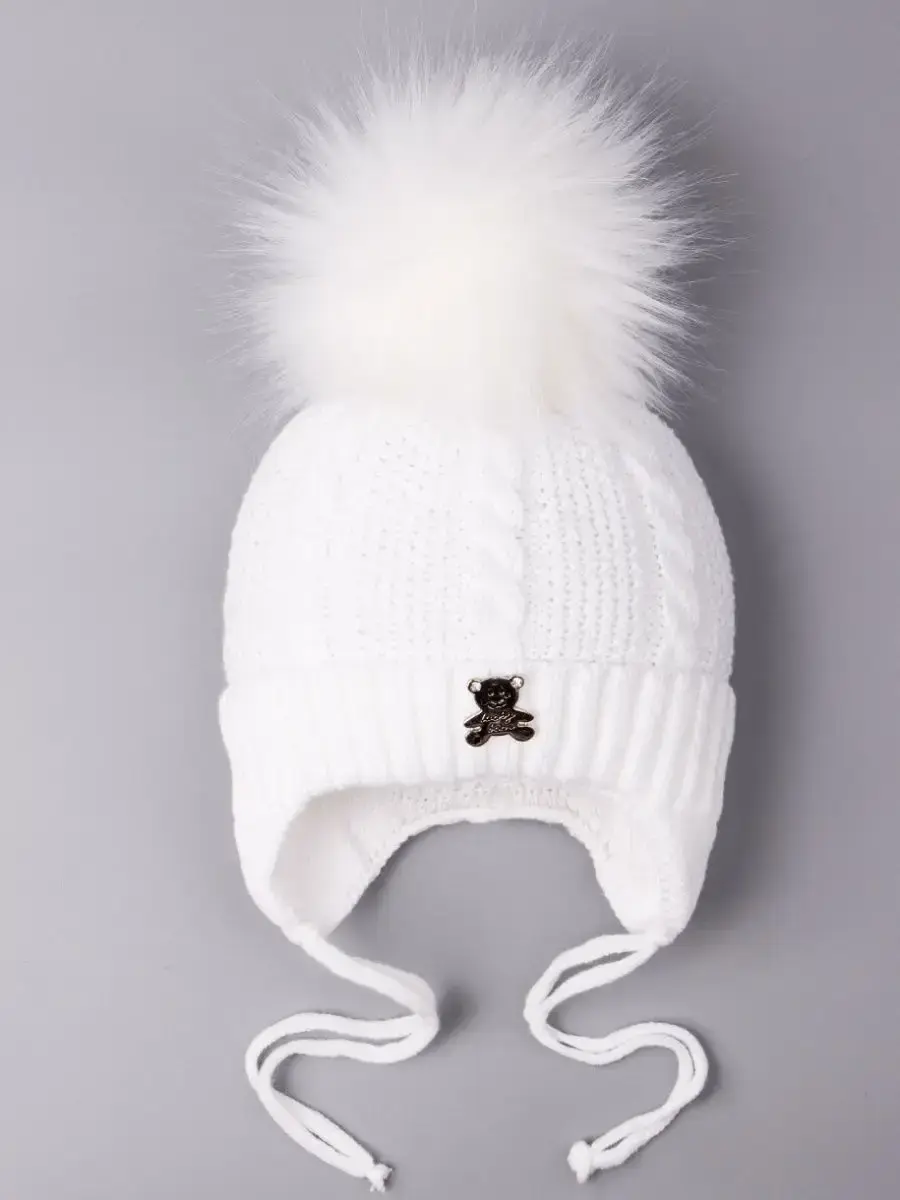 Шапка выполнена вязкой "коса"из высококачественной пряжи (в составе гиппоаллергенный акрил), приятная на ощупь ощущение и комфортна в носке. Красивый пышный помпон из искусственного меха и стильная металлическая брошь в виде медвежонка придают головному убору уникальный и стильный вид! Модель отлично подойдет как для мальчиков, так и для девочек.