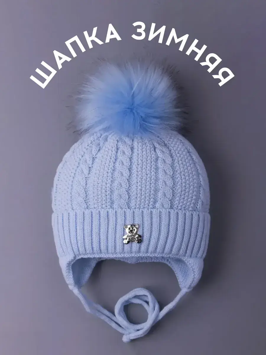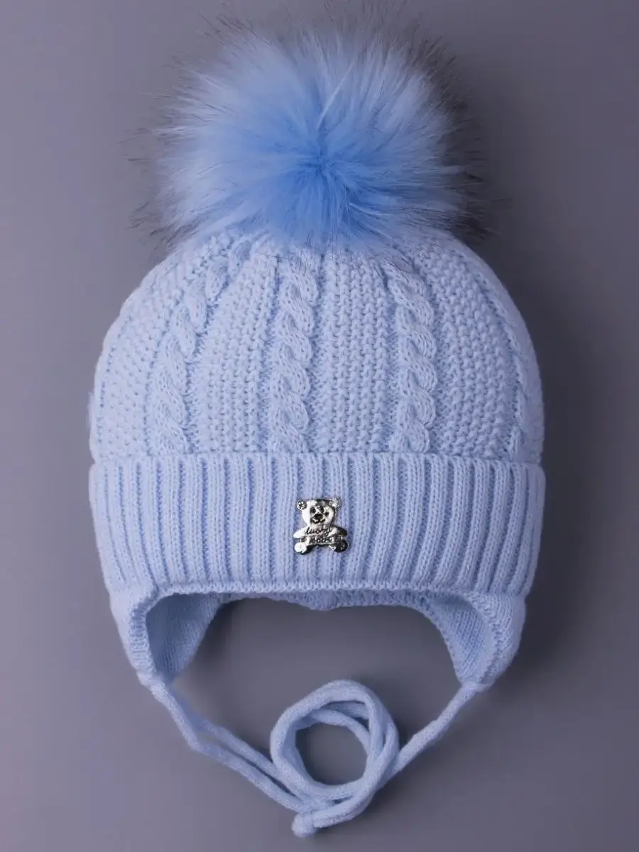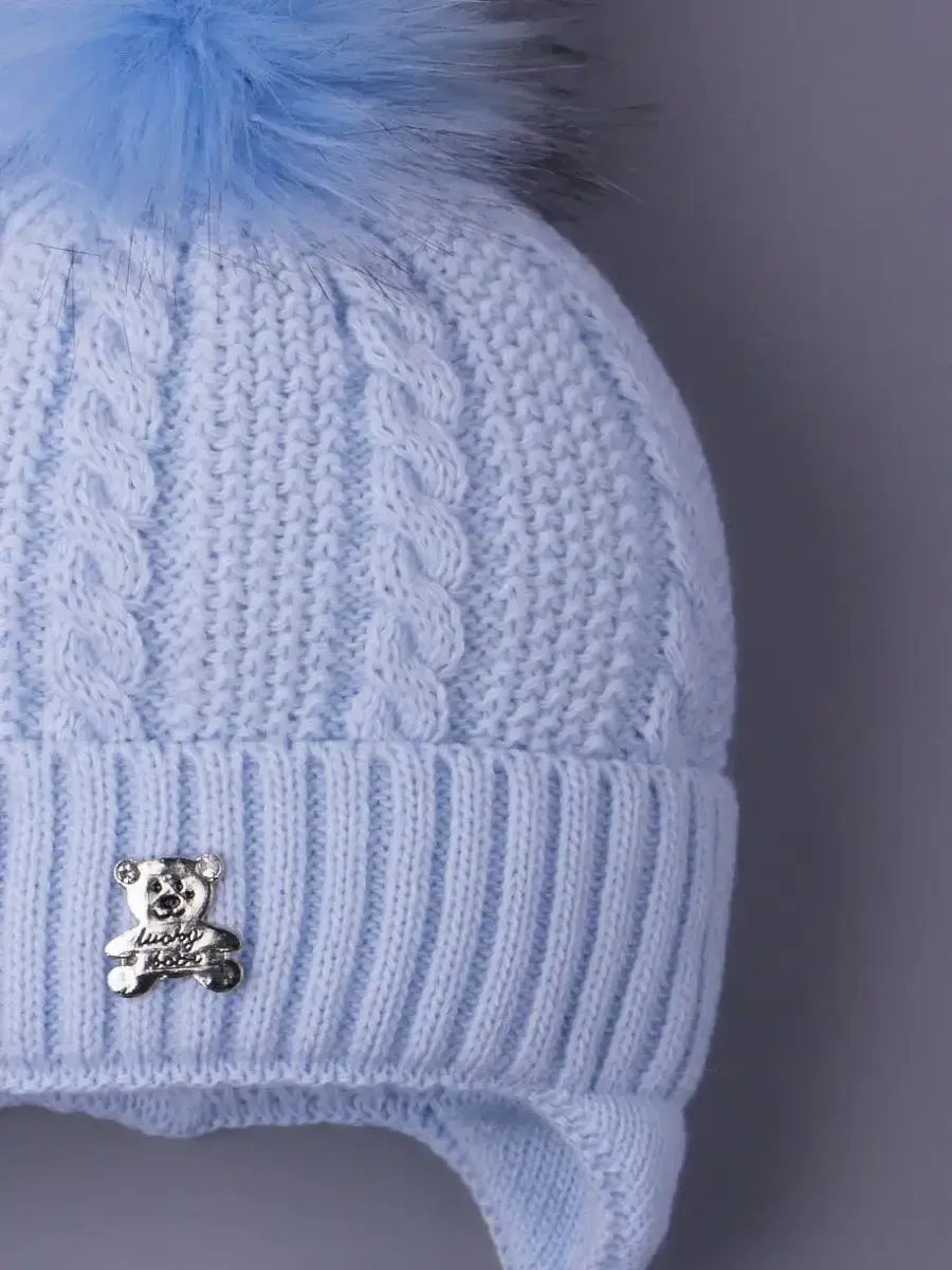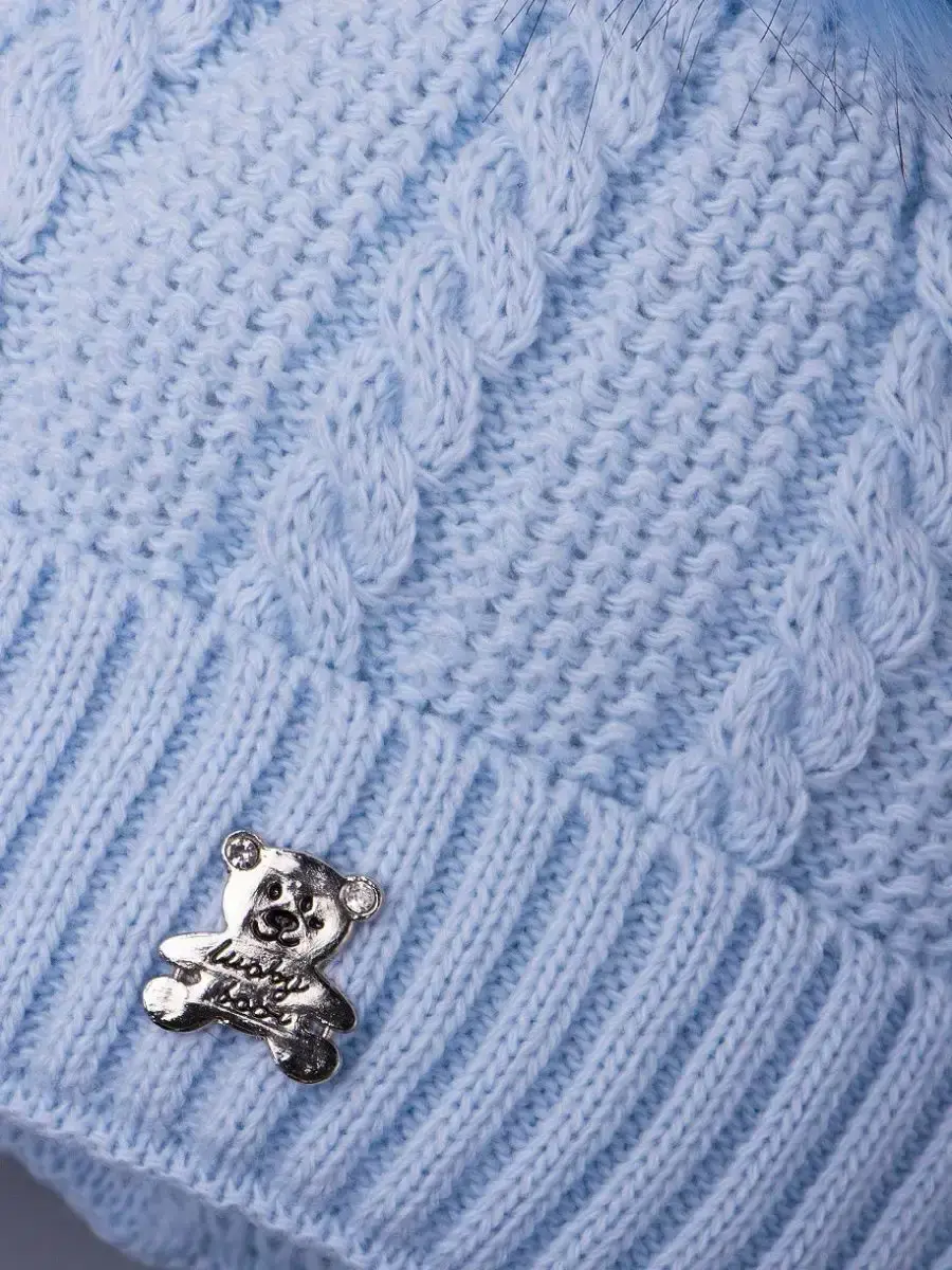 Шапка выполнена вязкой "коса"из высококачественной пряжи (в составе гиппоаллергенный акрил), приятная на ощупь ощущение и комфортна в носке. Красивый пышный помпон из искусственного меха и стильная металлическая брошь в виде медвежонка придают головному убору уникальный и стильный вид! Модель отлично подойдет как для мальчиков, так и для девочек.