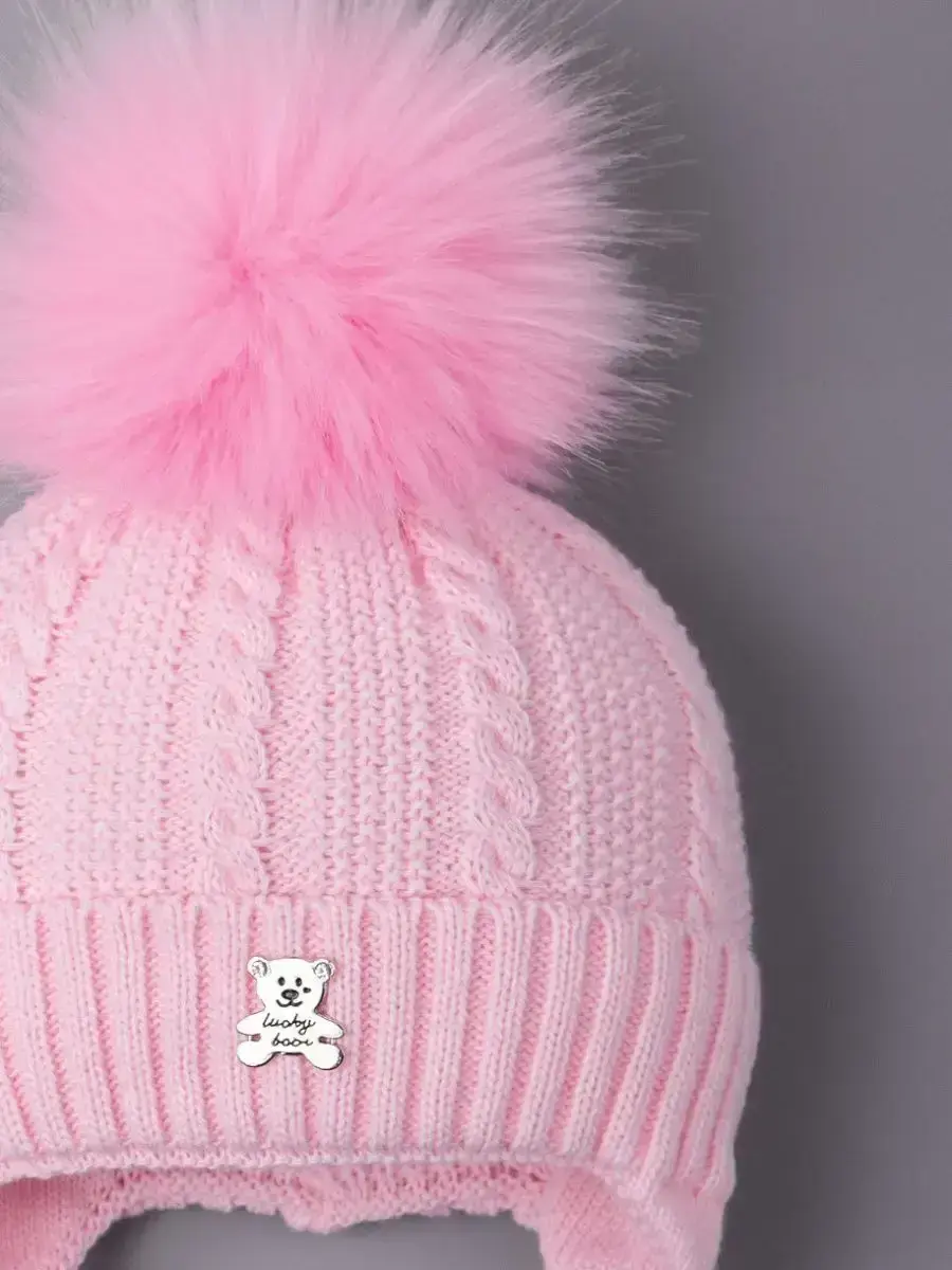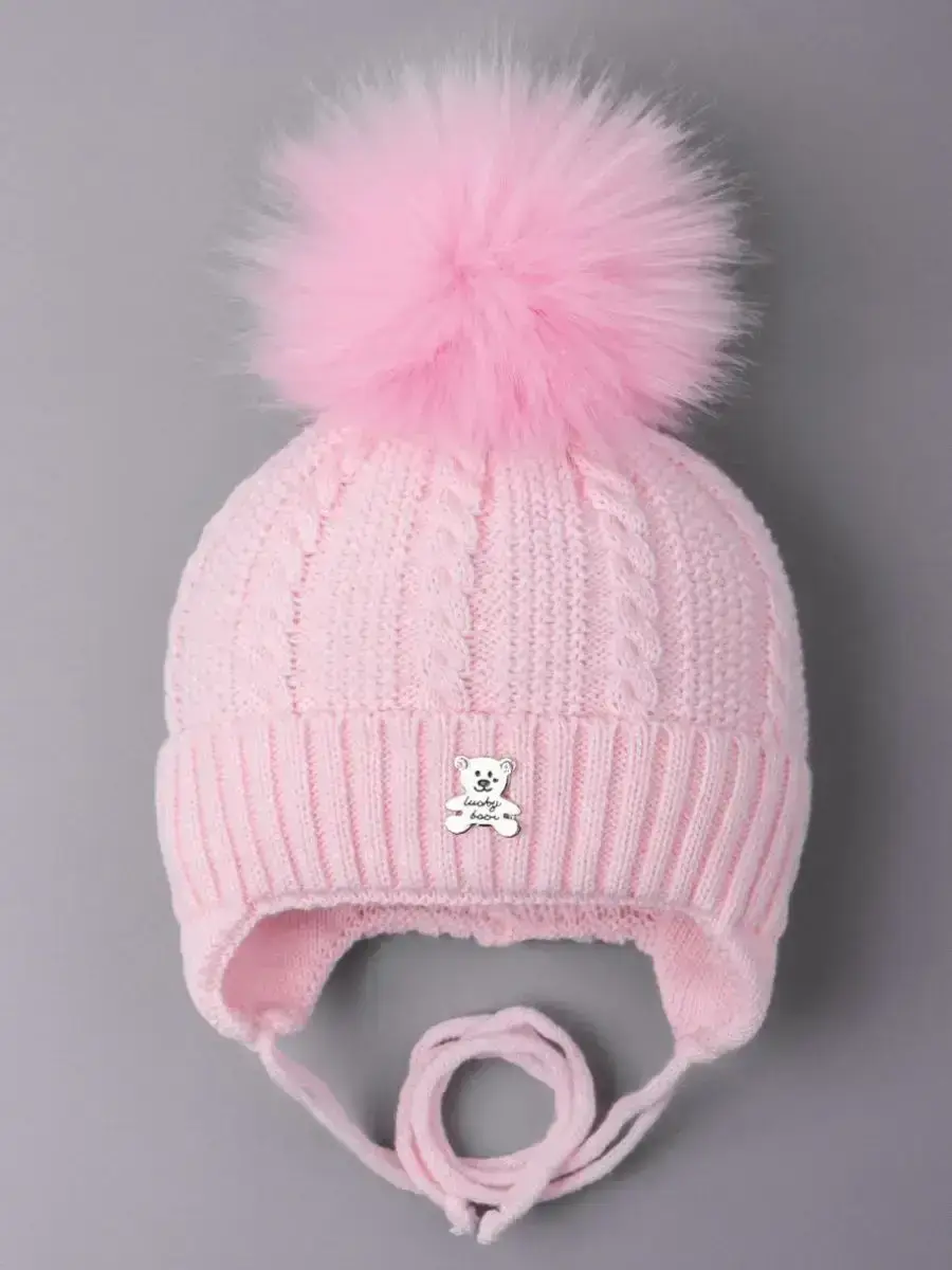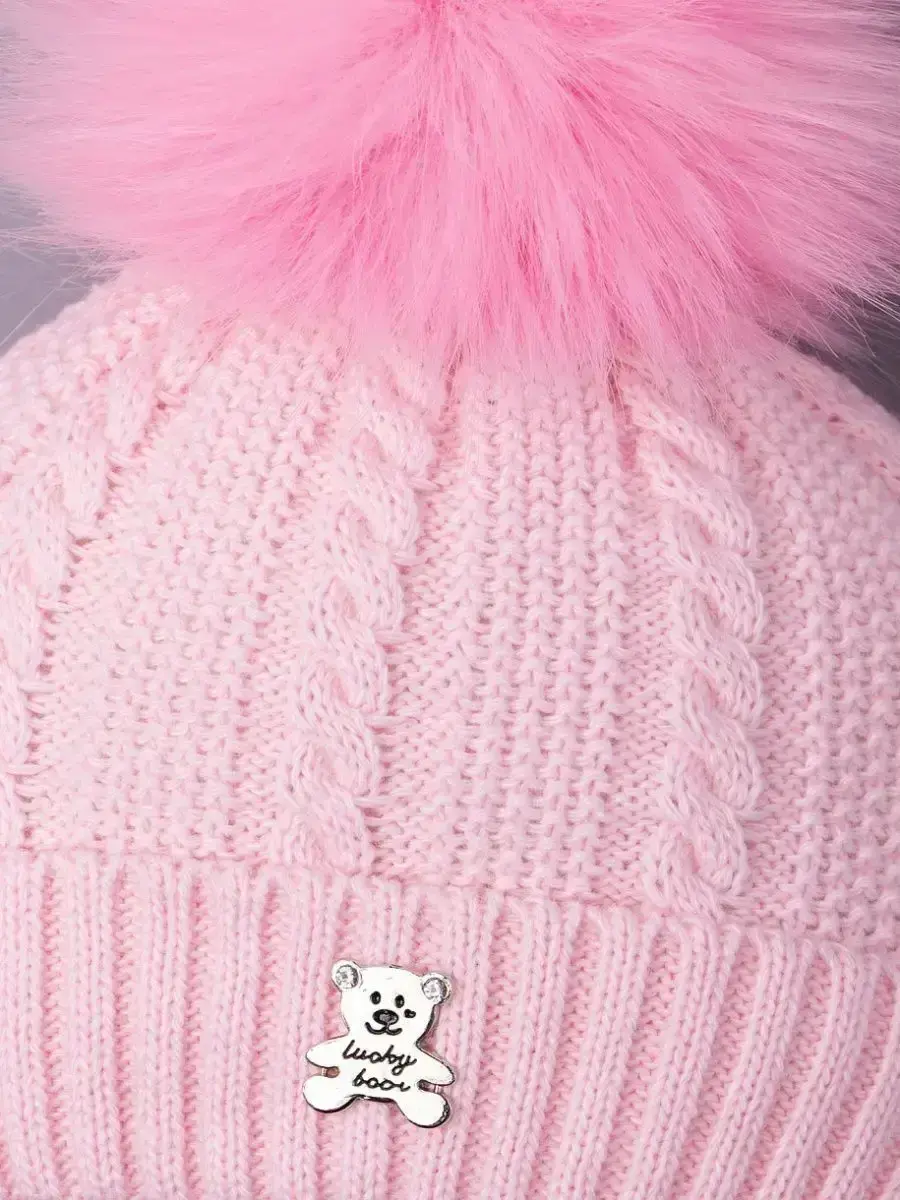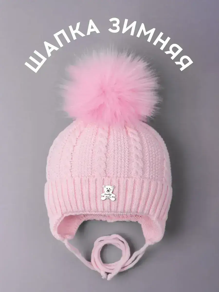 Шапка выполнена вязкой "коса"из высококачественной пряжи (в составе гиппоаллергенный акрил), приятная на ощупь ощущение и комфортна в носке. Красивый пышный помпон из искусственного меха и стильная металлическая брошь в виде медвежонка придают головному убору уникальный и стильный вид! Модель отлично подойдет как для мальчиков, так и для девочек.