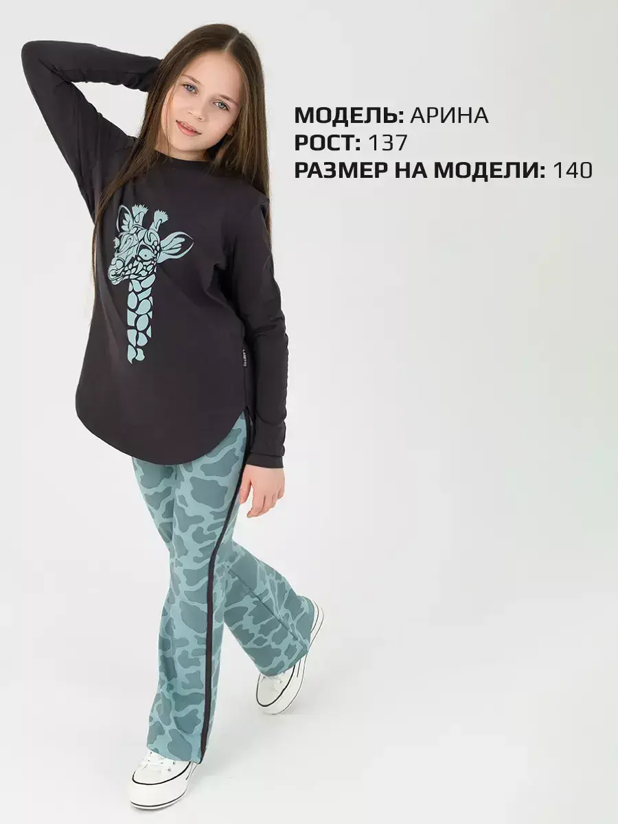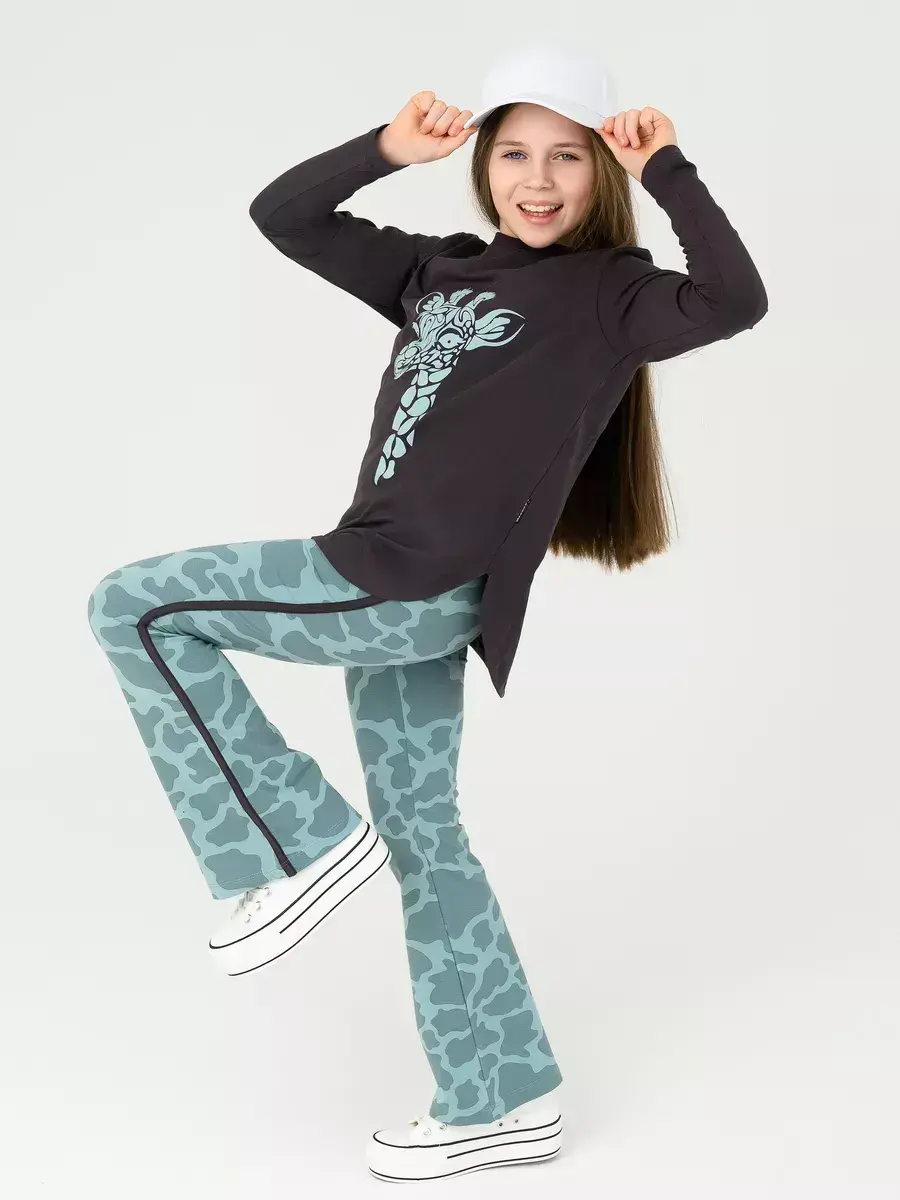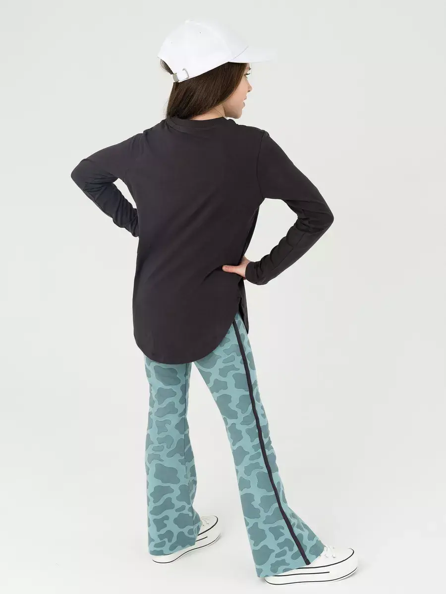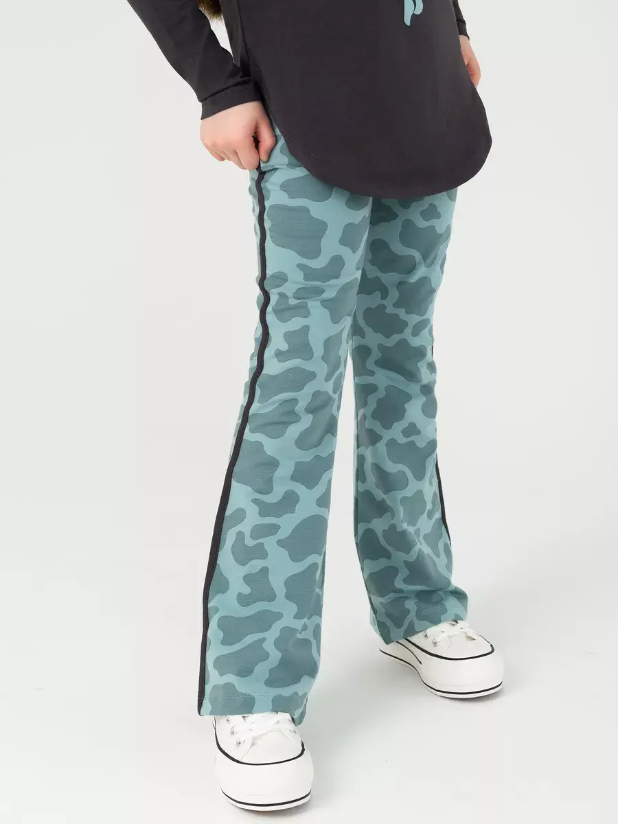 Брюки клеш для девочек - выполнены также из трикотажной ткани на основе натурального хлопка. Широкий пояс на резинке не сдавливает животик ребенка и обеспечивает надежную фиксацию на талии. Расширенные от колена к низу брючины придают образу оригинальность и следуют последним модным тенденциям.