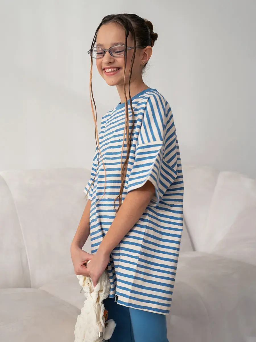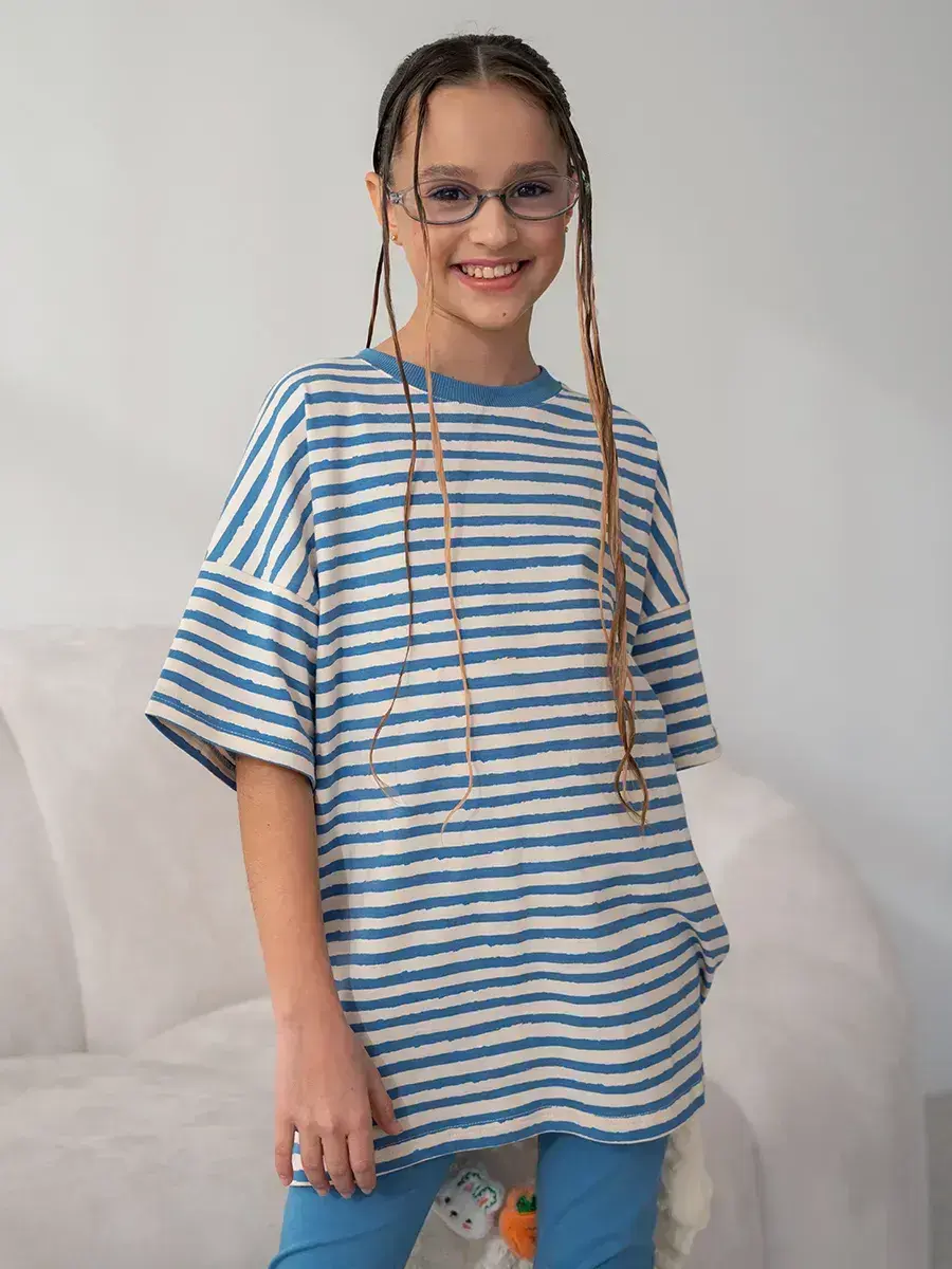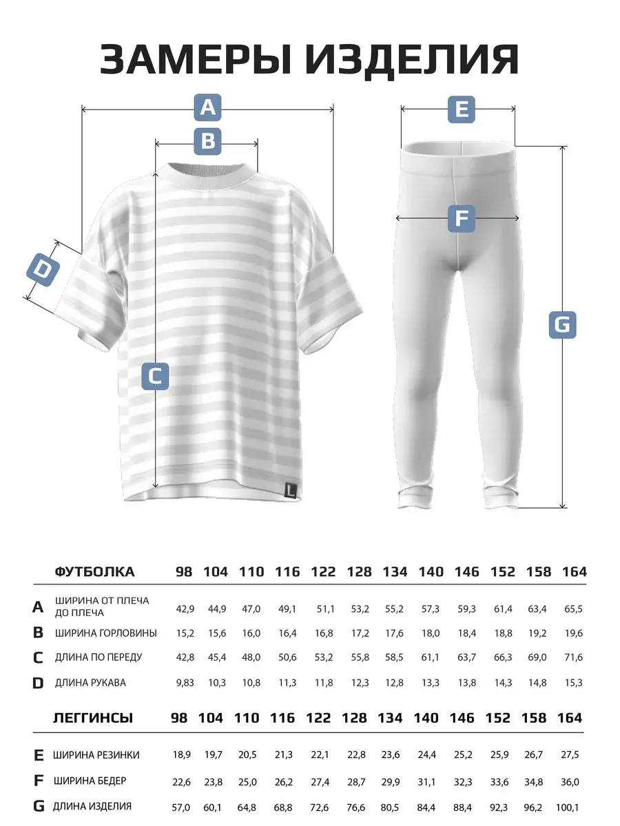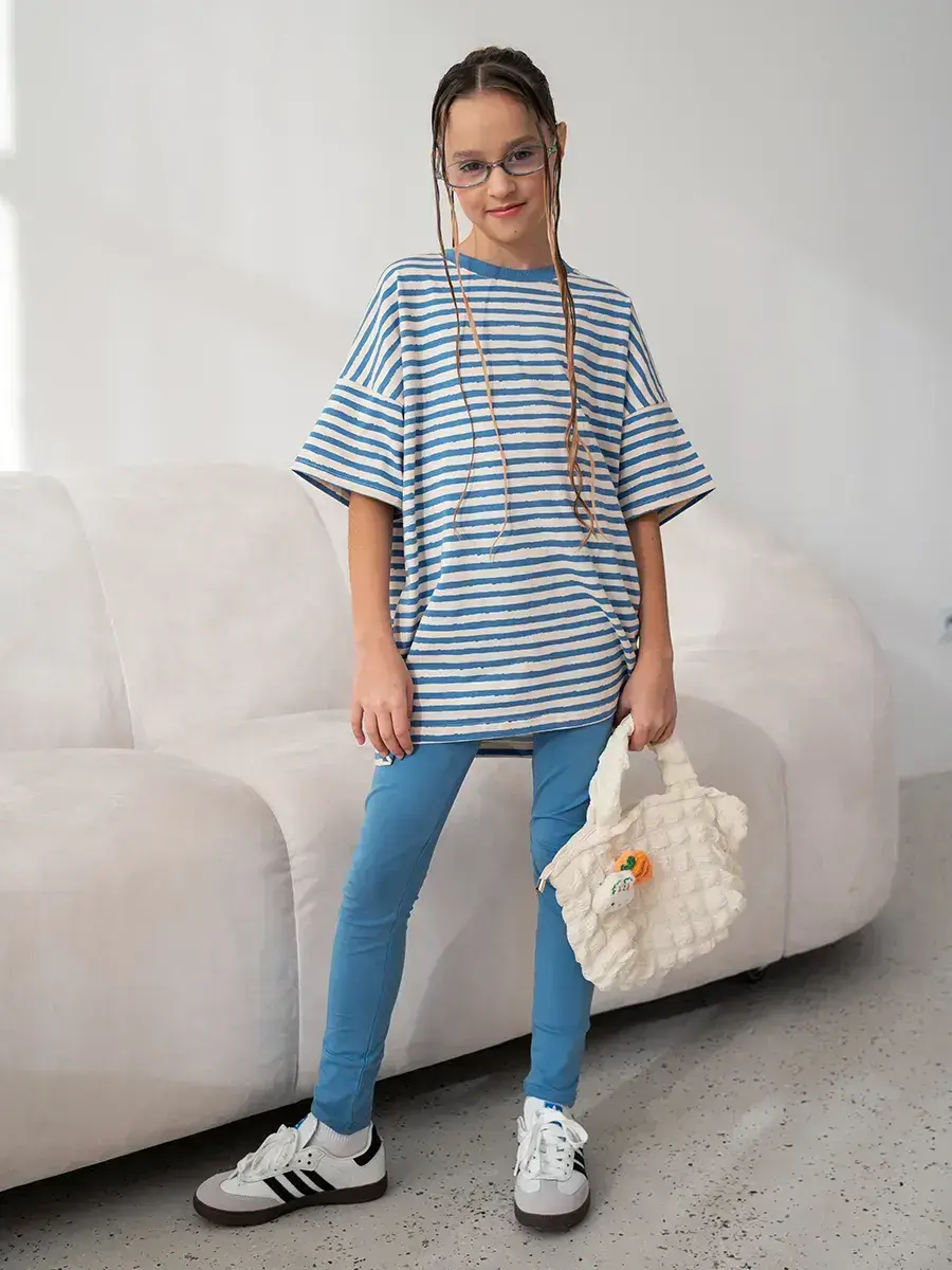 Комплект из футболки и лосин подходит детям и подросткам. Эта одежда станет отличным выбором для маленьких модниц. Яркая футболка с принтом "тельняшка" привлекает внимание и создает стильный образ. Леггинсы идеально дополняют наряд. Они предлагают комфорт в повседневной носке для девочки.