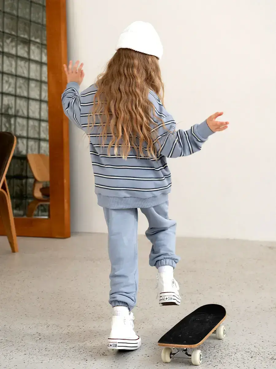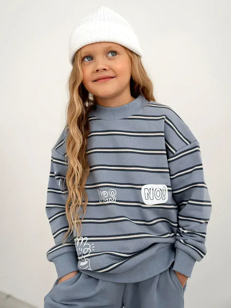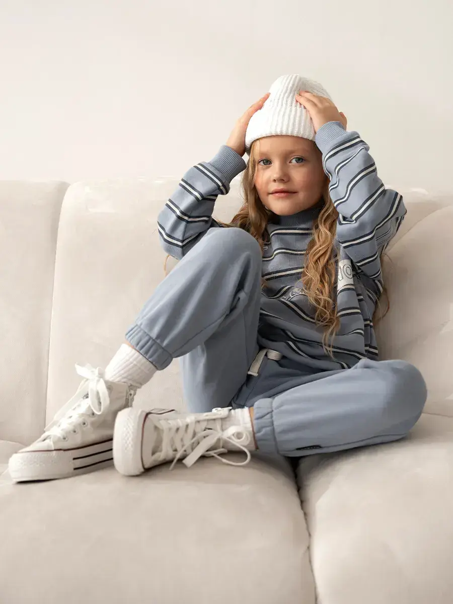 Свитшот в полоску для девочки будет актуален для создания как повседневных, так и спортивных образов.