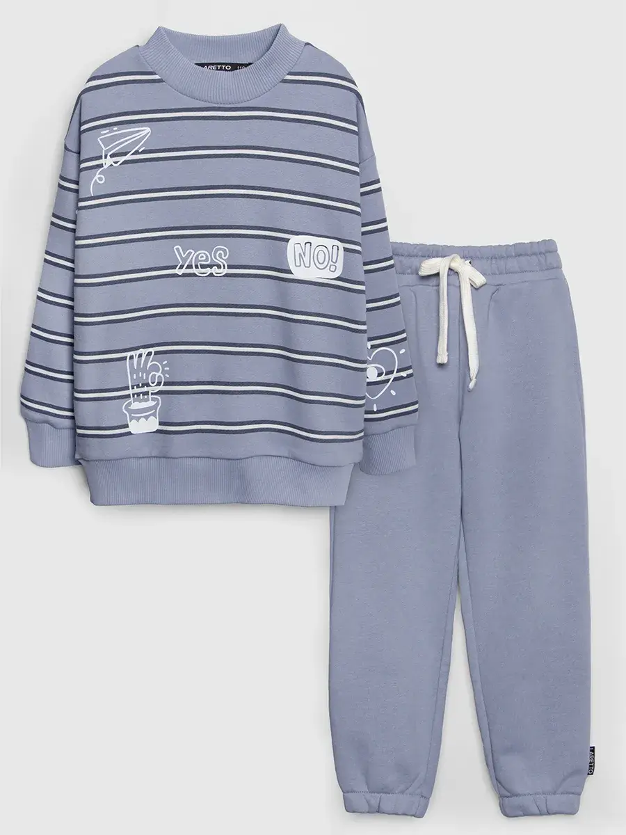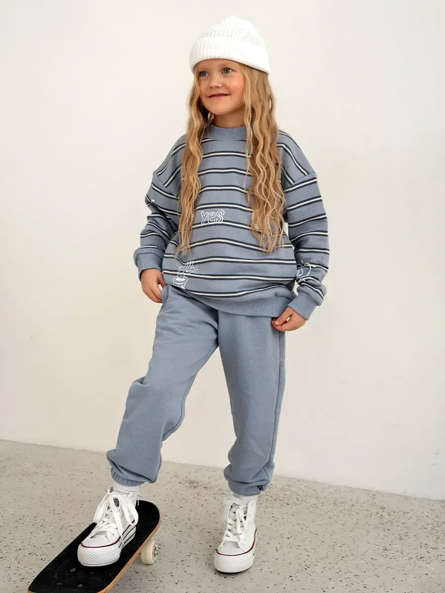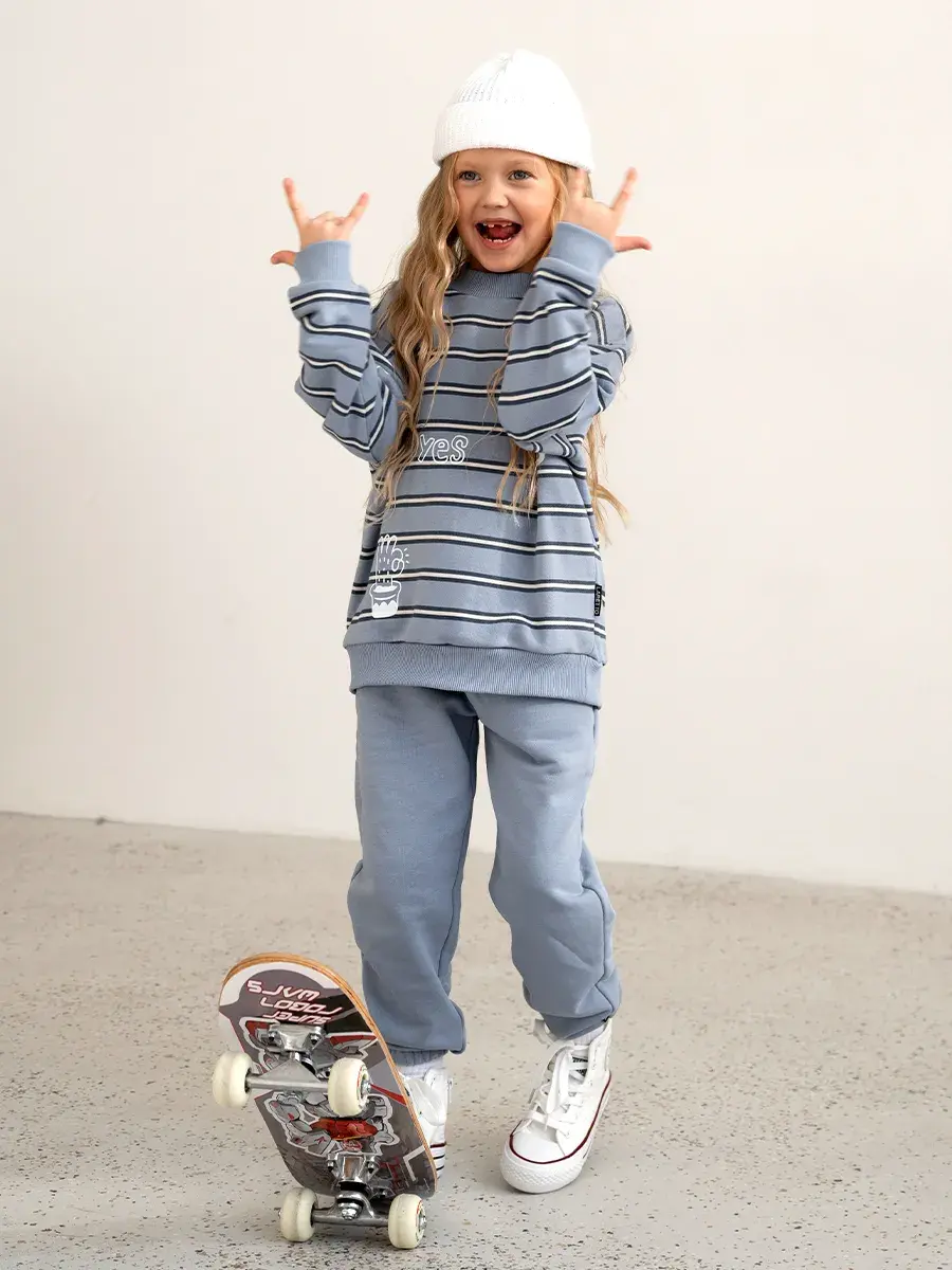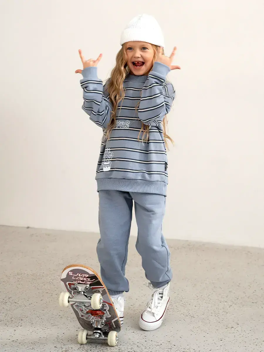 Стильный и удобный голубой костюм для девочки, состоящий из свитшота и брюк. Изготовлен из высококачественного материала, который дарит комфорт на протяжении всего дня.