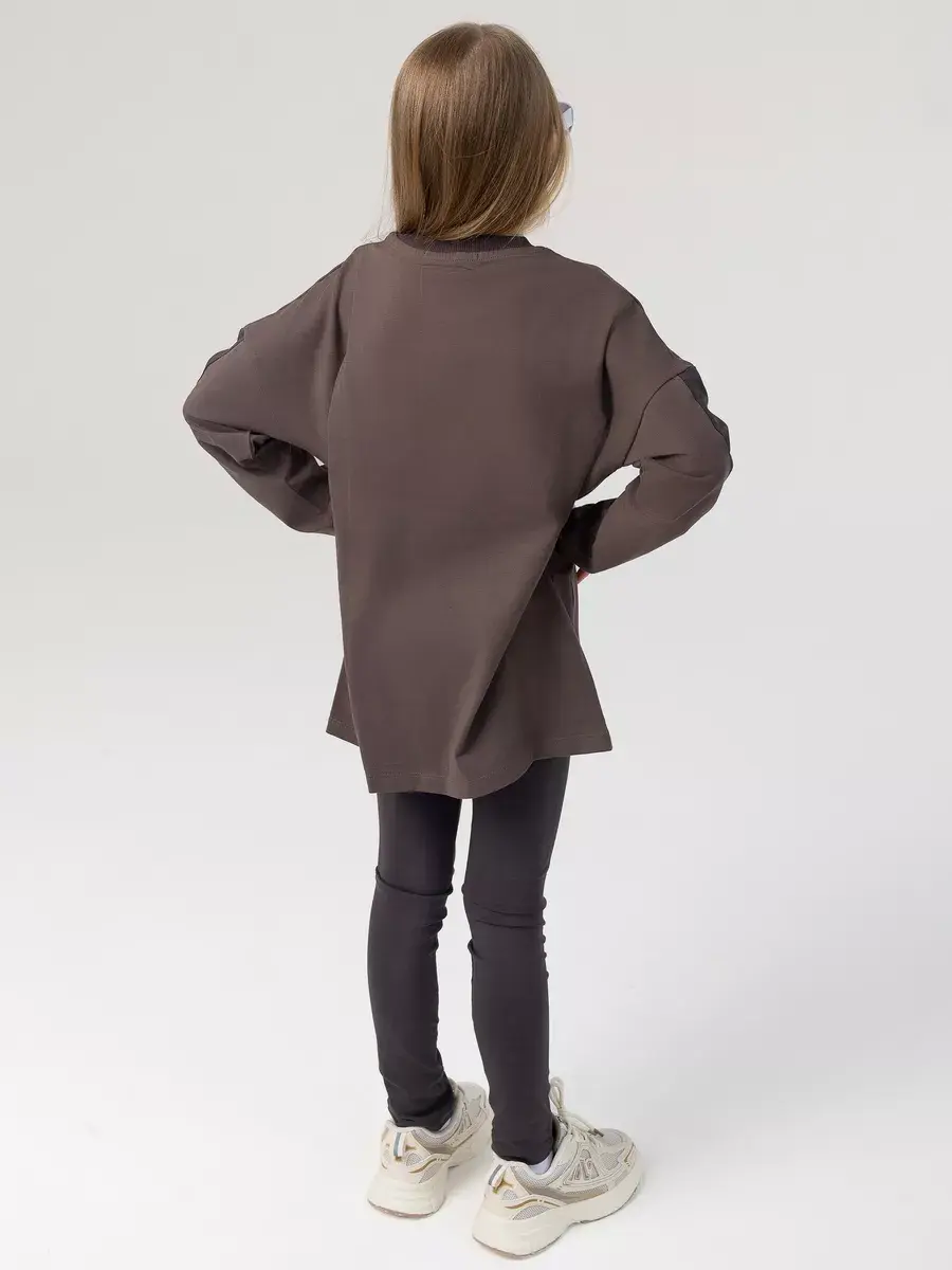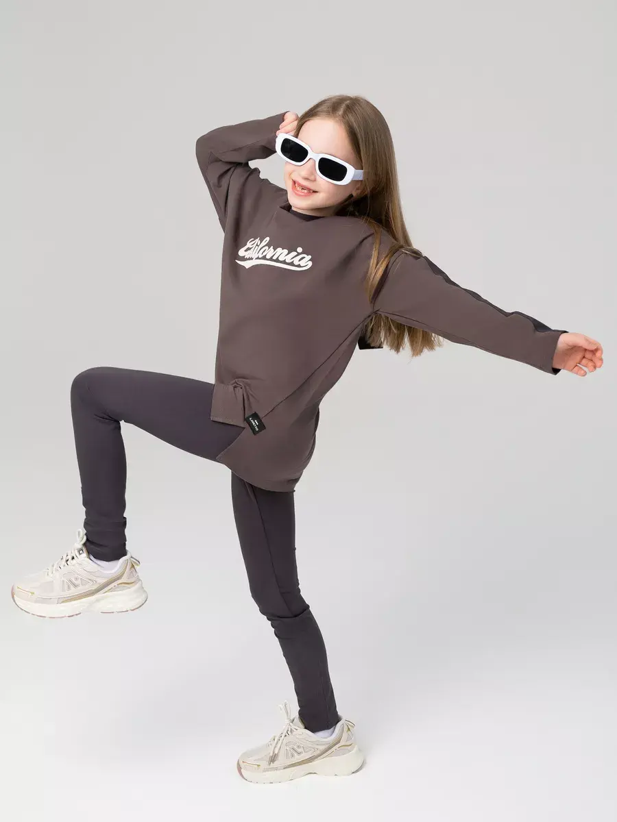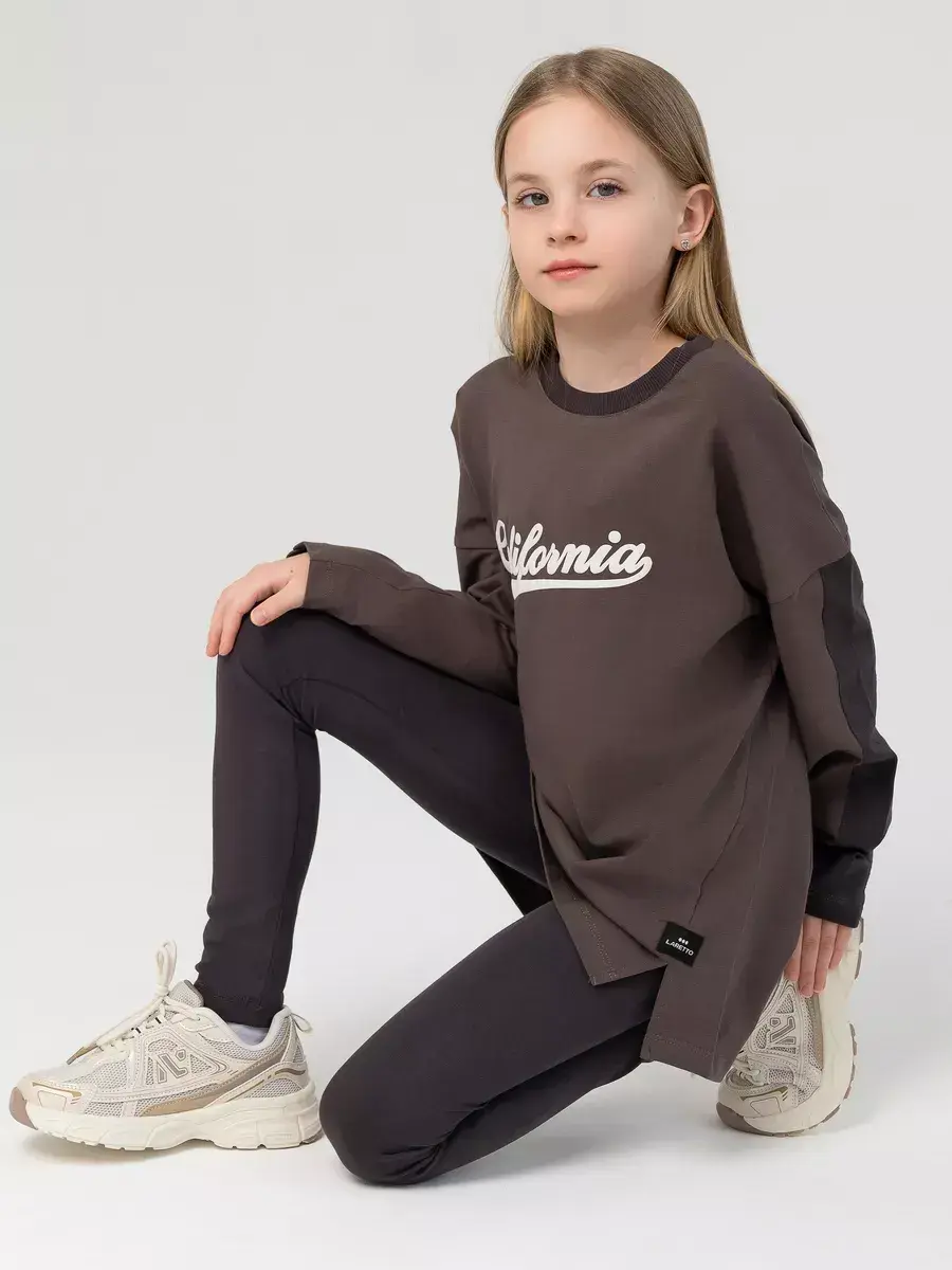 Коричневый спортивный костюм для девочки, состоящий из лонгслива и леггинсов - это идеальный выбор для любого случая. Он сочетает в себе удобство, стиль и функциональность, именно то, что необходимо каждому активному ребенку.