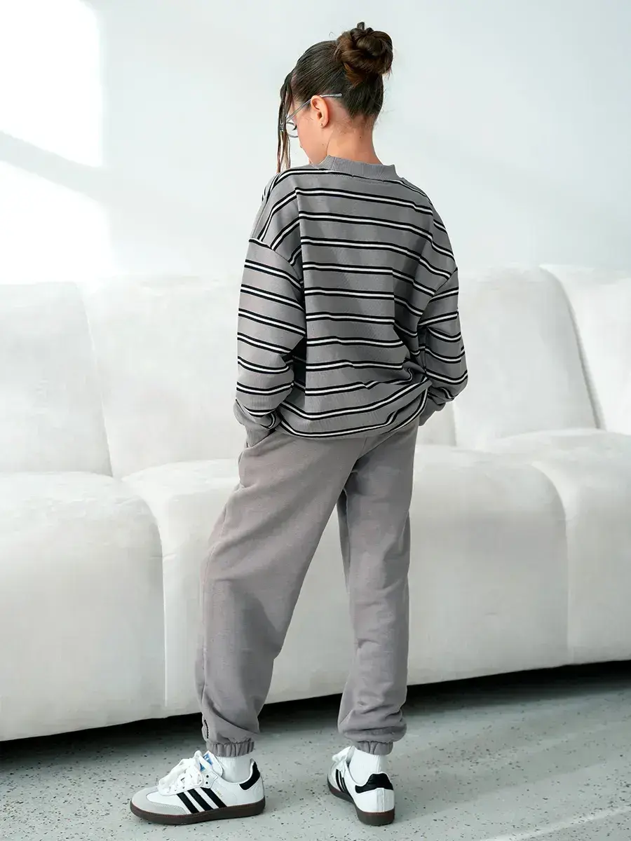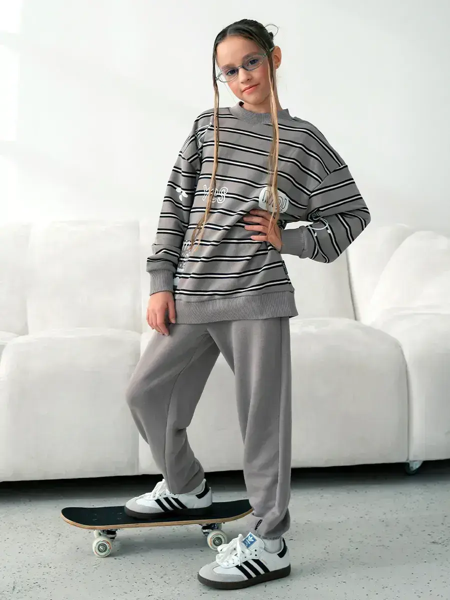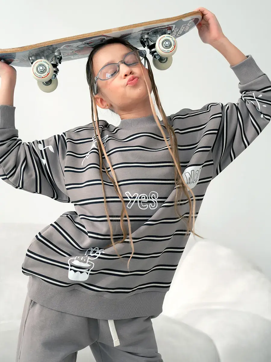 Свитшот в полоску для девочки будет актуален для создания как повседневных, так и спортивных образов.