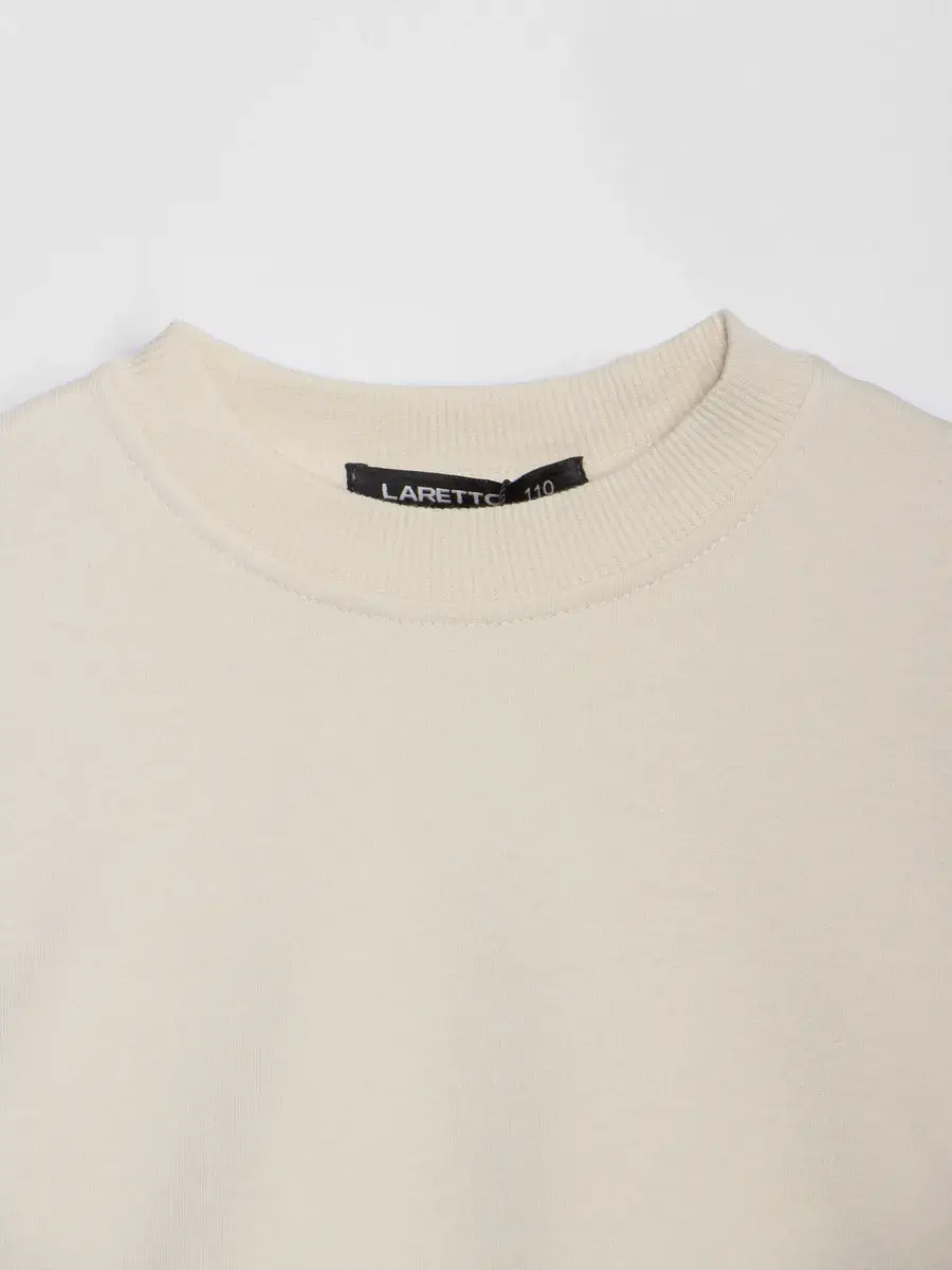 Стильный и удобный бежевый костюм для девочки на осень, состоящий из свитшота и брюк. Изготовлен из высококачественного материала, который дарит комфорт на протяжении всего дня.