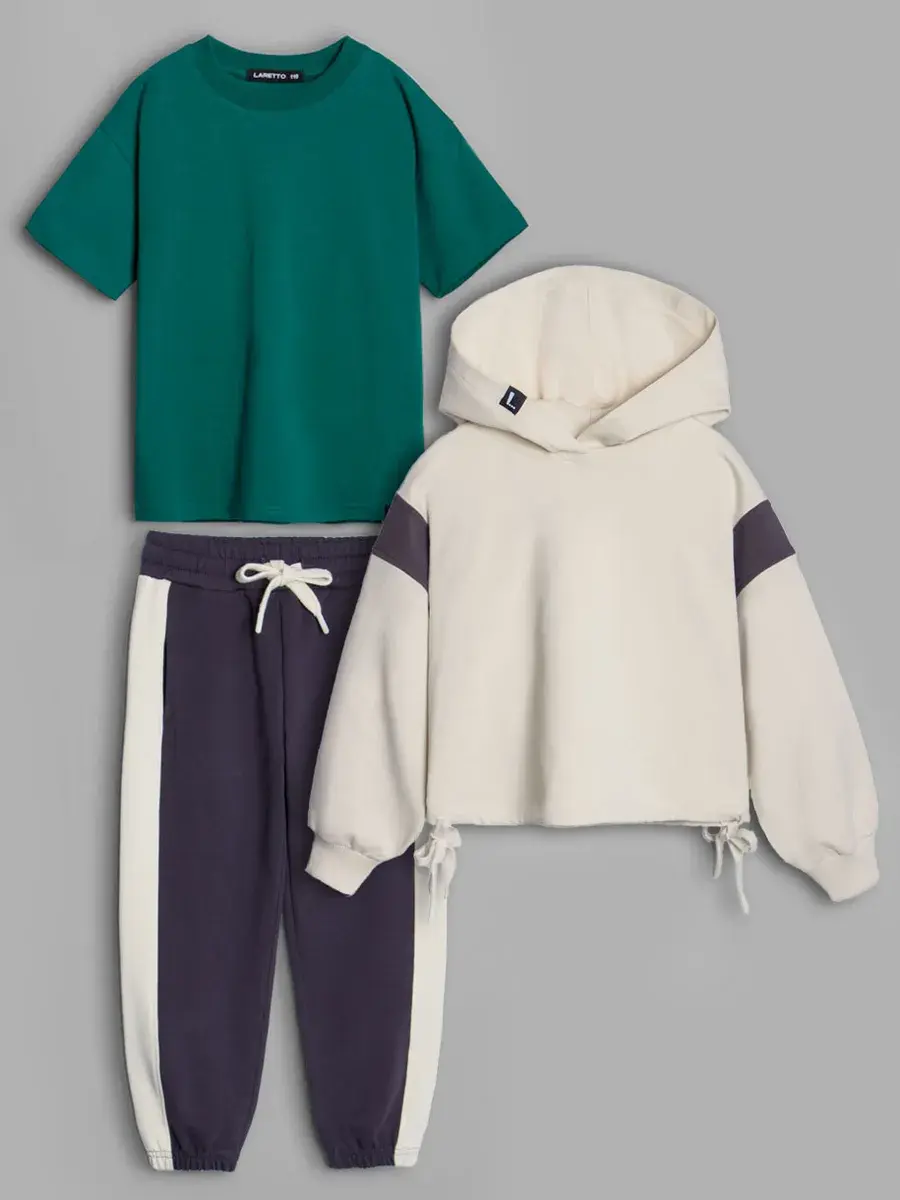Костюм для девочки — идеальное сочетание стиля и комфорта. Спортивный костюм в школу для девочки состоит из трех предметов: уютного худи с капюшоном, теплых брюк на резинке и мягкой футболки. Каждый элемент костюма создан с заботой о маленьких модницах, предпочитающих активный образ жизни.