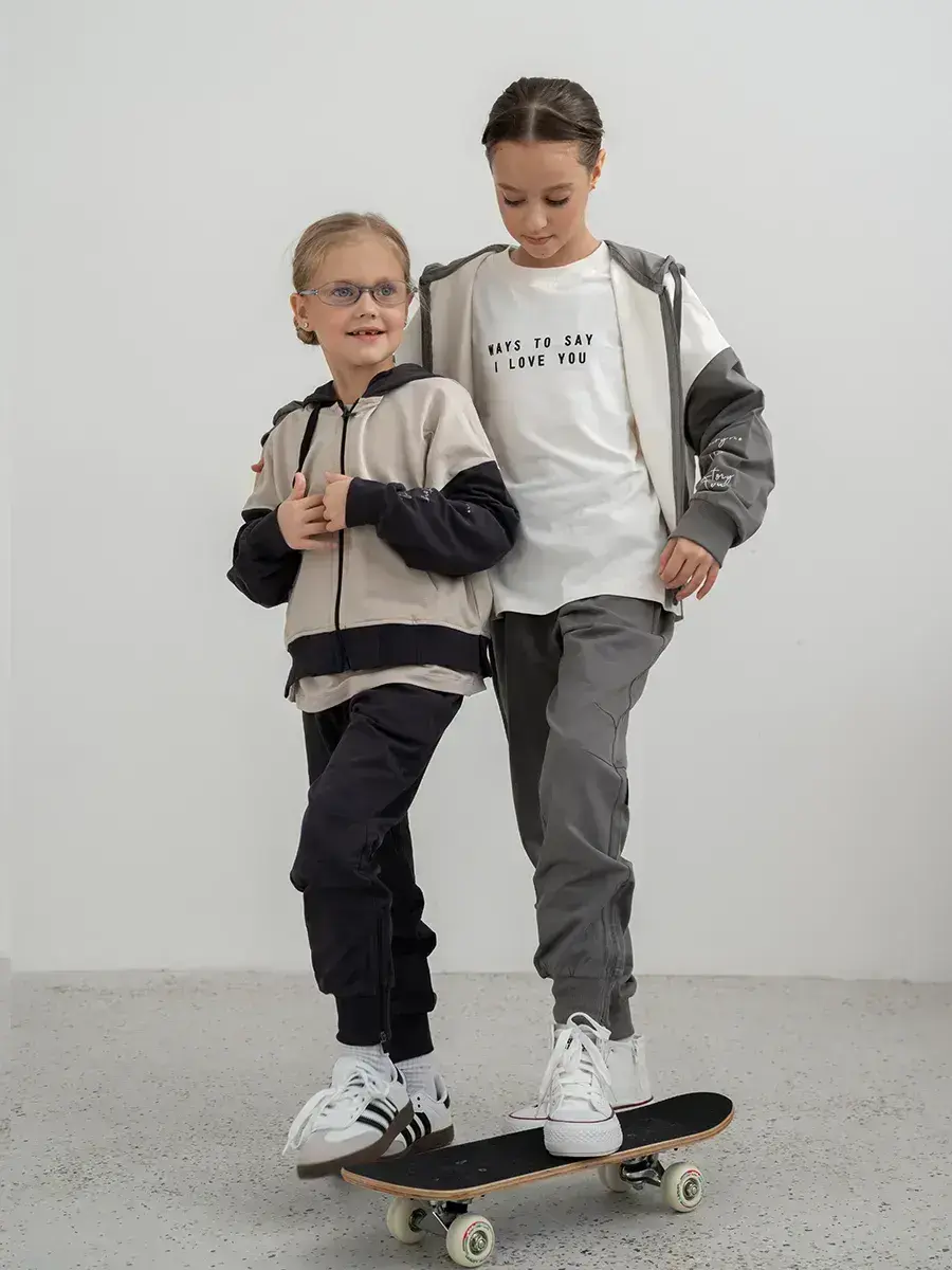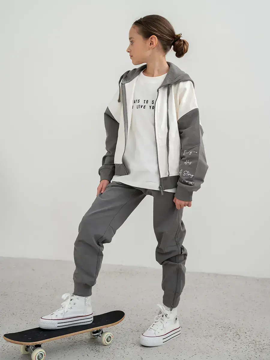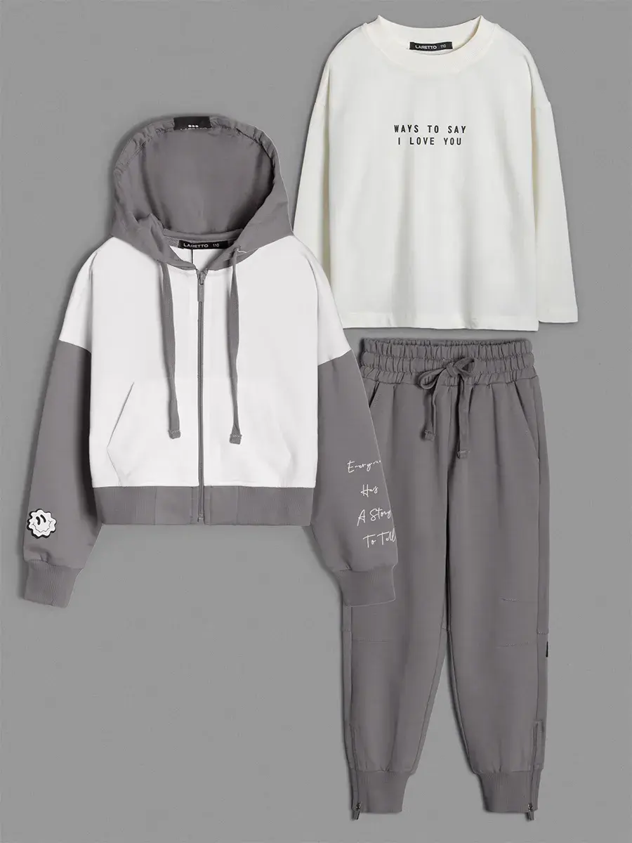 Стильный спортивный костюм для девочки. В базовых цветах, состоит из уютного свитшота, практичного лонгслива и комфортных брюк джоггеров. Этот комплект идеально подходит для активных игр, занятий спортом и повседневной носки.