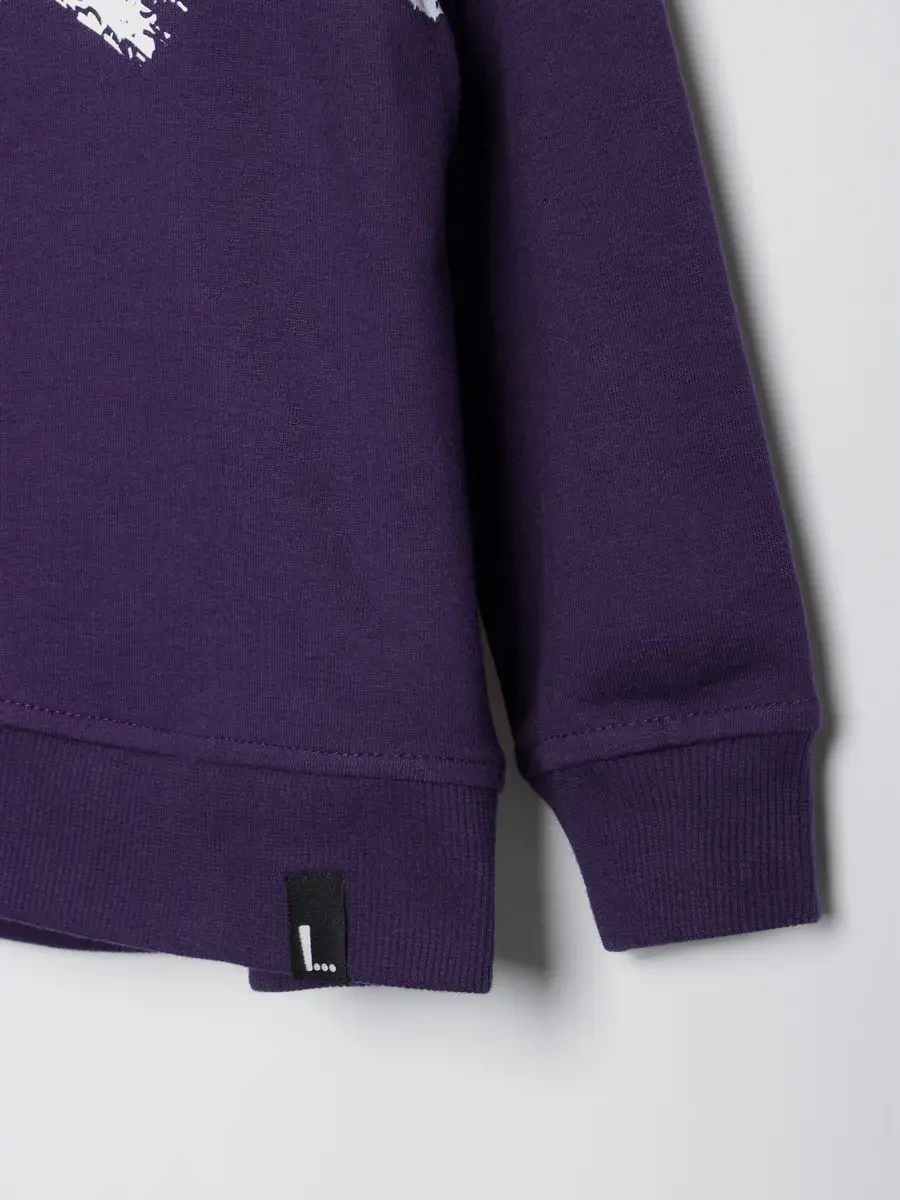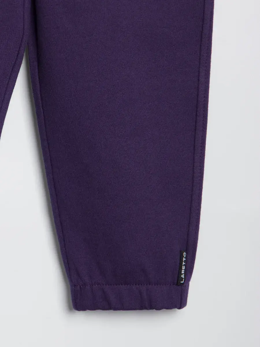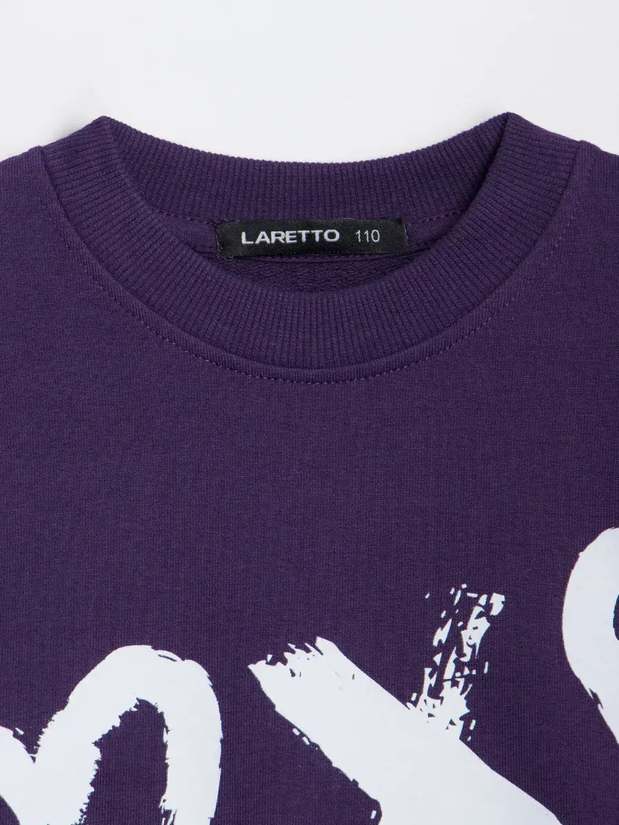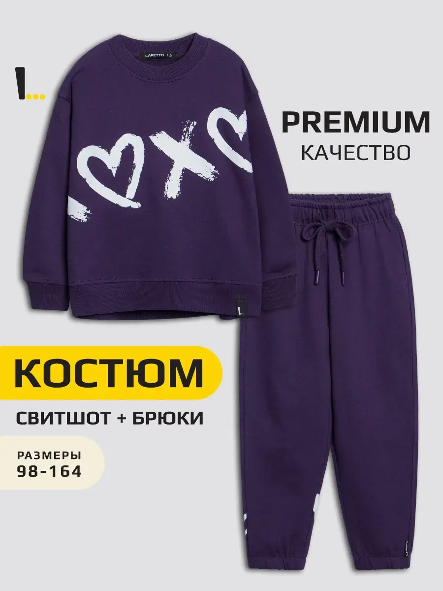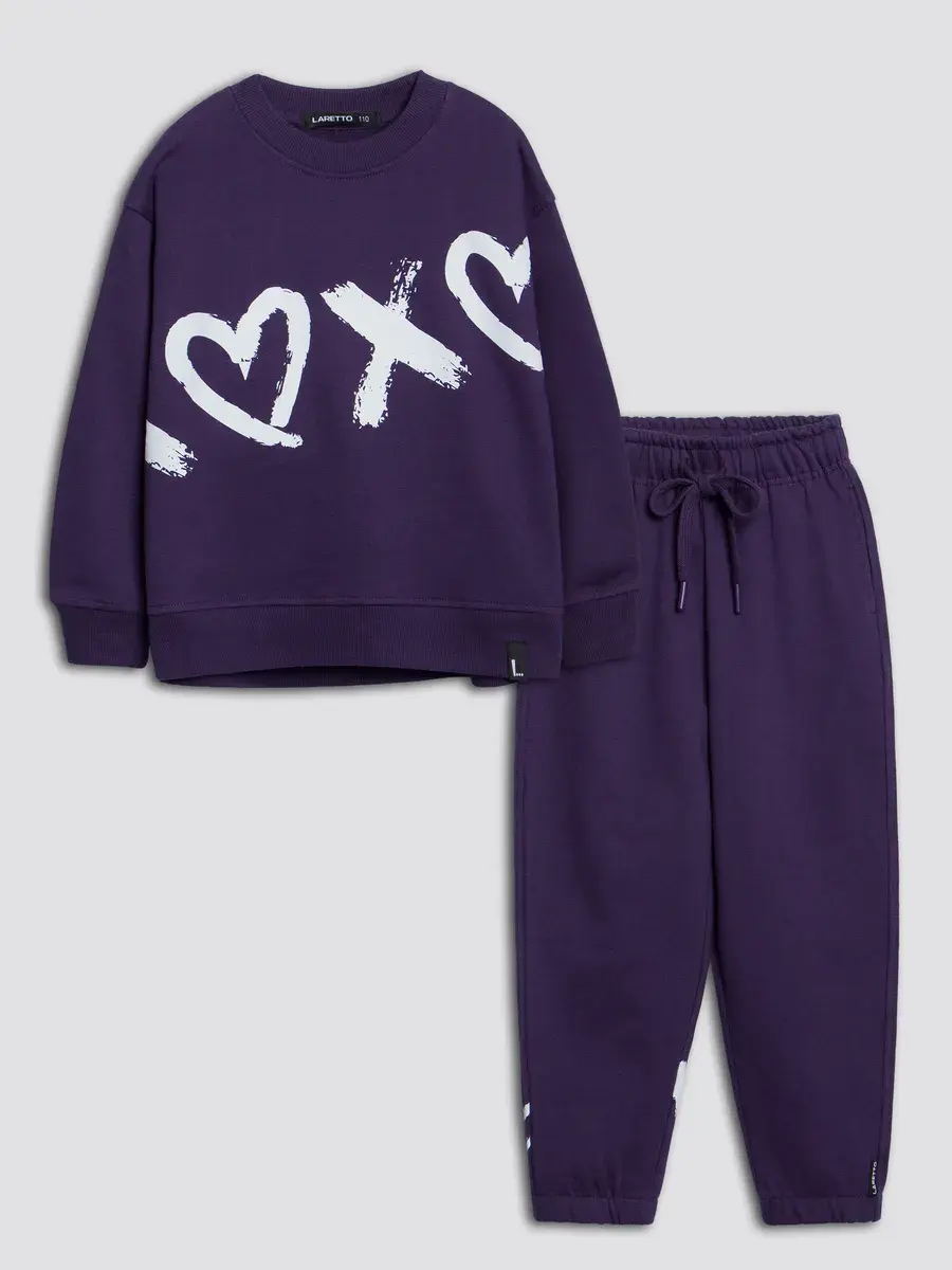 Стильный и удобный фиолетовый костюм для девочки, состоящий из свитшота и брюк. Изготовлен из высококачественного материала, который дарит комфорт на протяжении всего дня.