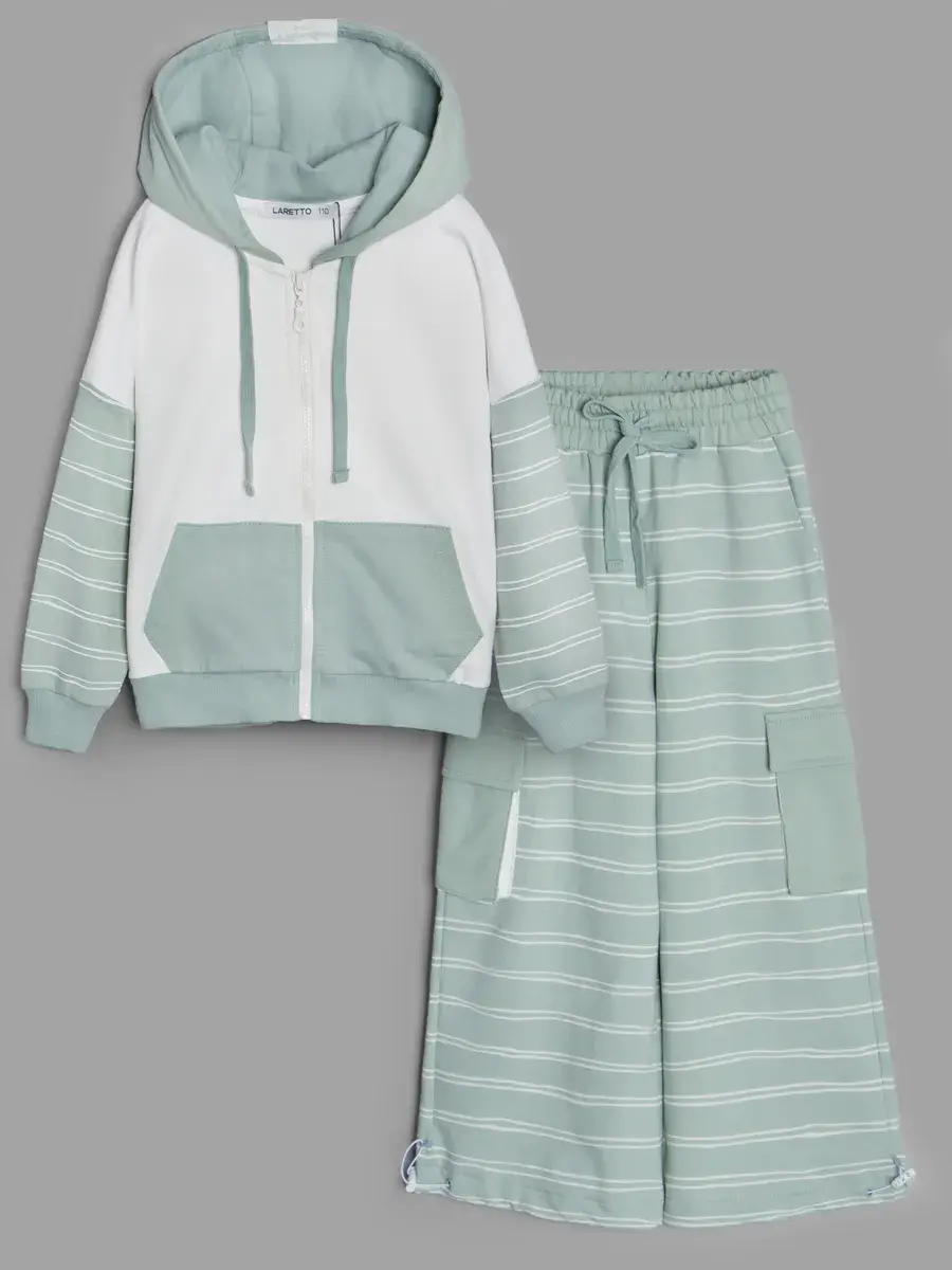 Спортивный костюм для девочки — идеальное сочетание стиля и комфорта. Это — уникальная коллекция от LARETTO. Детский костюм в полоску состоит из уютного худи для девочек и брюк палаццо на резинке со шнурками. Каждый элемент костюма для девочек создан с заботой о маленьких модницах, предпочитающих активный образ жизни.