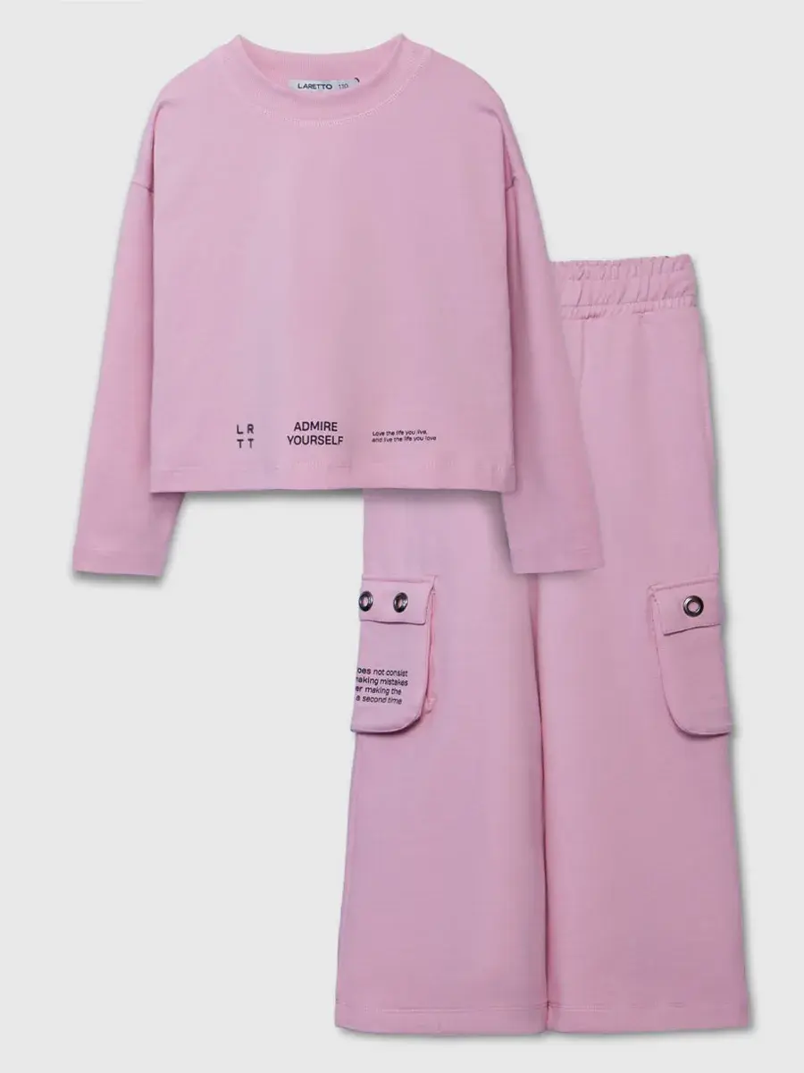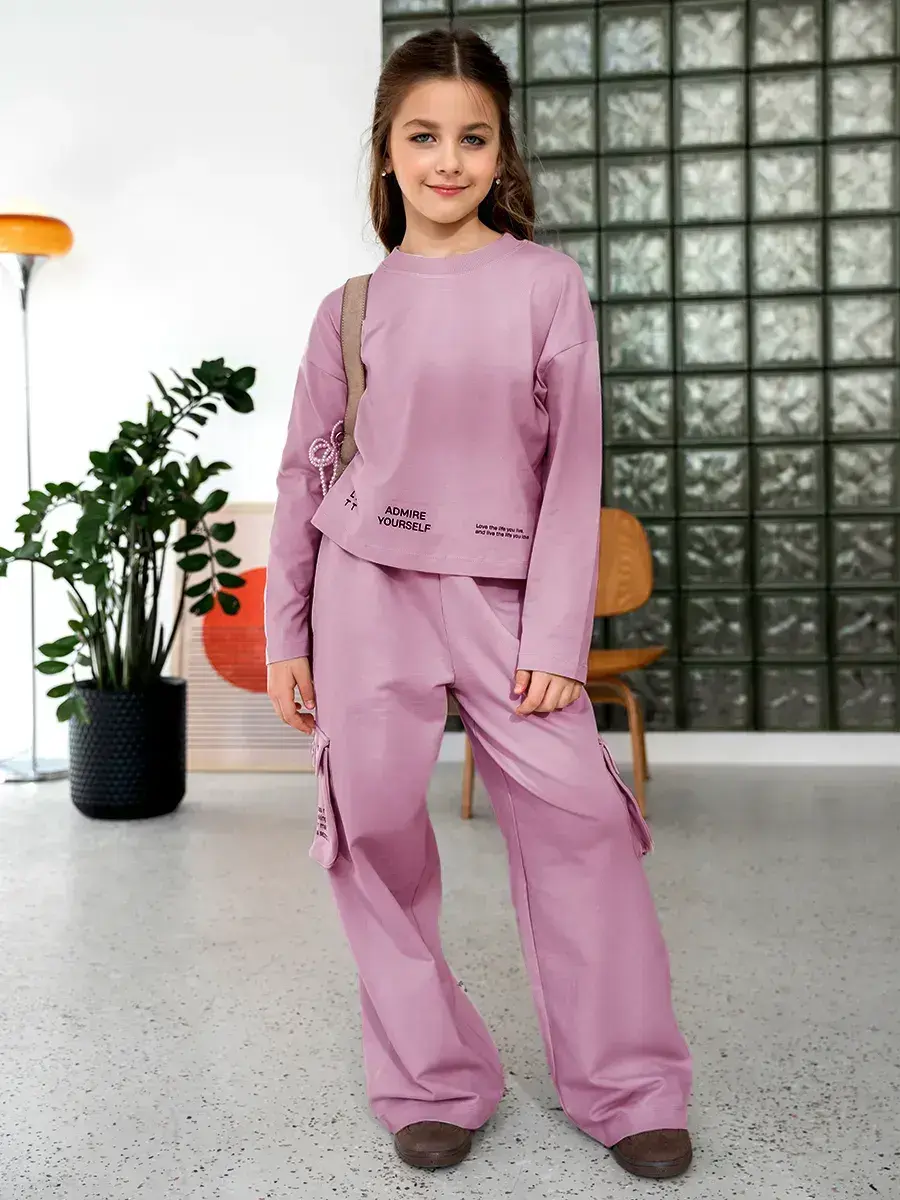 Костюм для девочки, который сочетает в себе стиль, комфорт и качество. Этот трикотажный детский костюм состоит из удобного лонгслива и модных брюк клеш, которые подарят вашей малышке свободу движений в прохладные осенние дни.