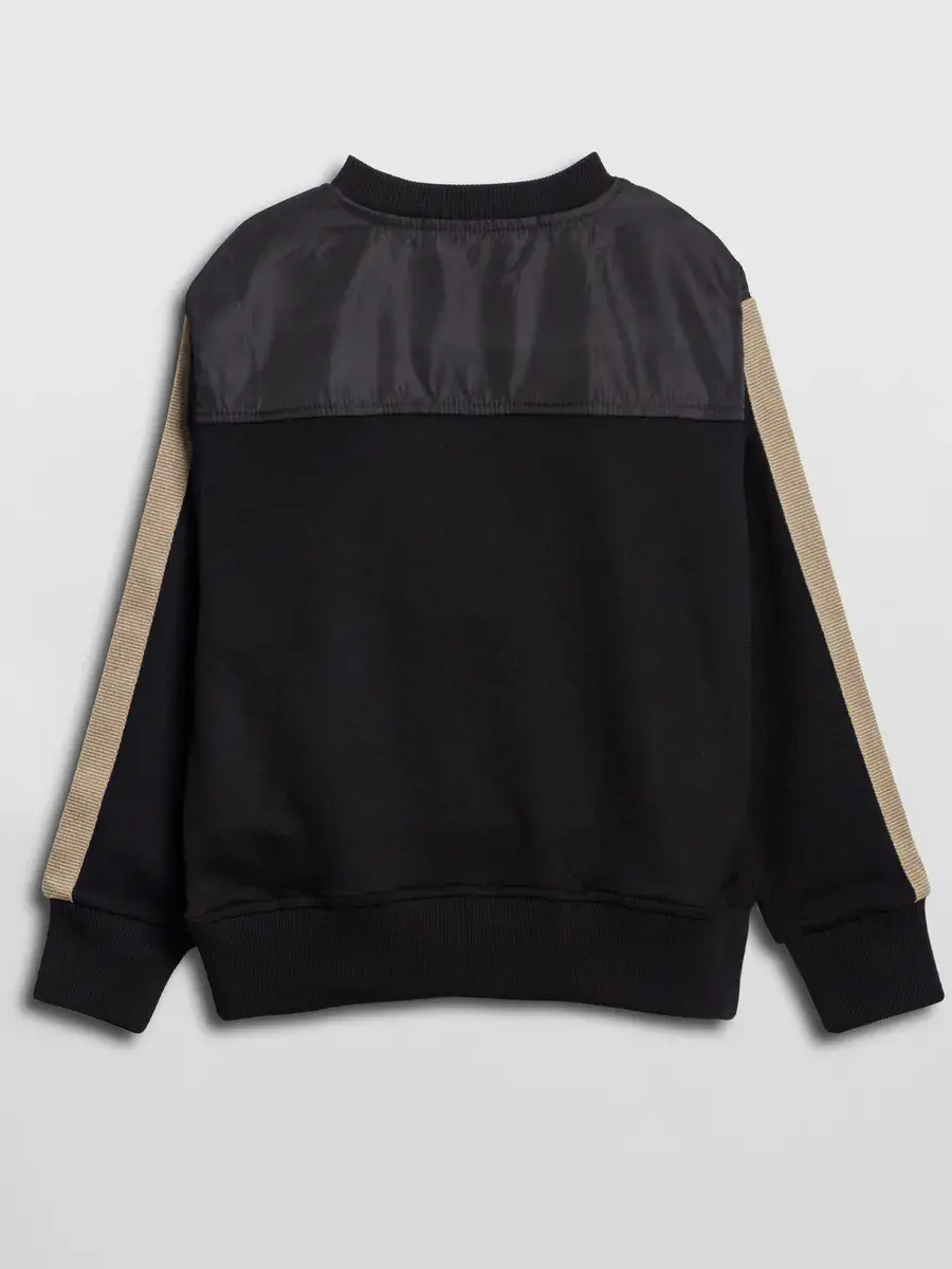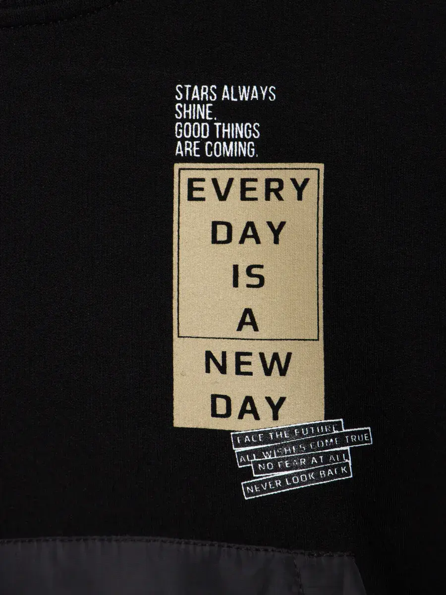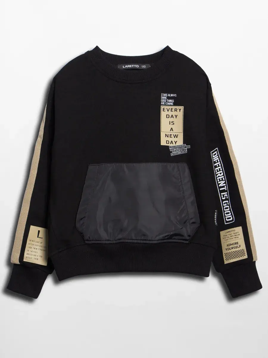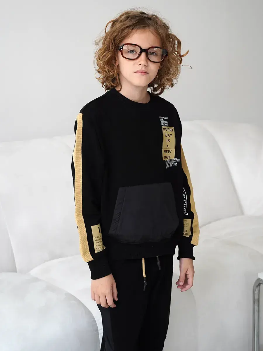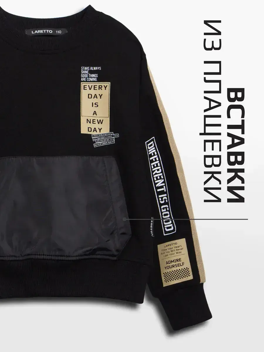 Свитшот для мальчика: Изготовлено из высококачественного материала, который обеспечивает тепло в прохладную погоду. Стильная детская кофта украшена ярким принтом и надписями, добавляя игривости в образ.