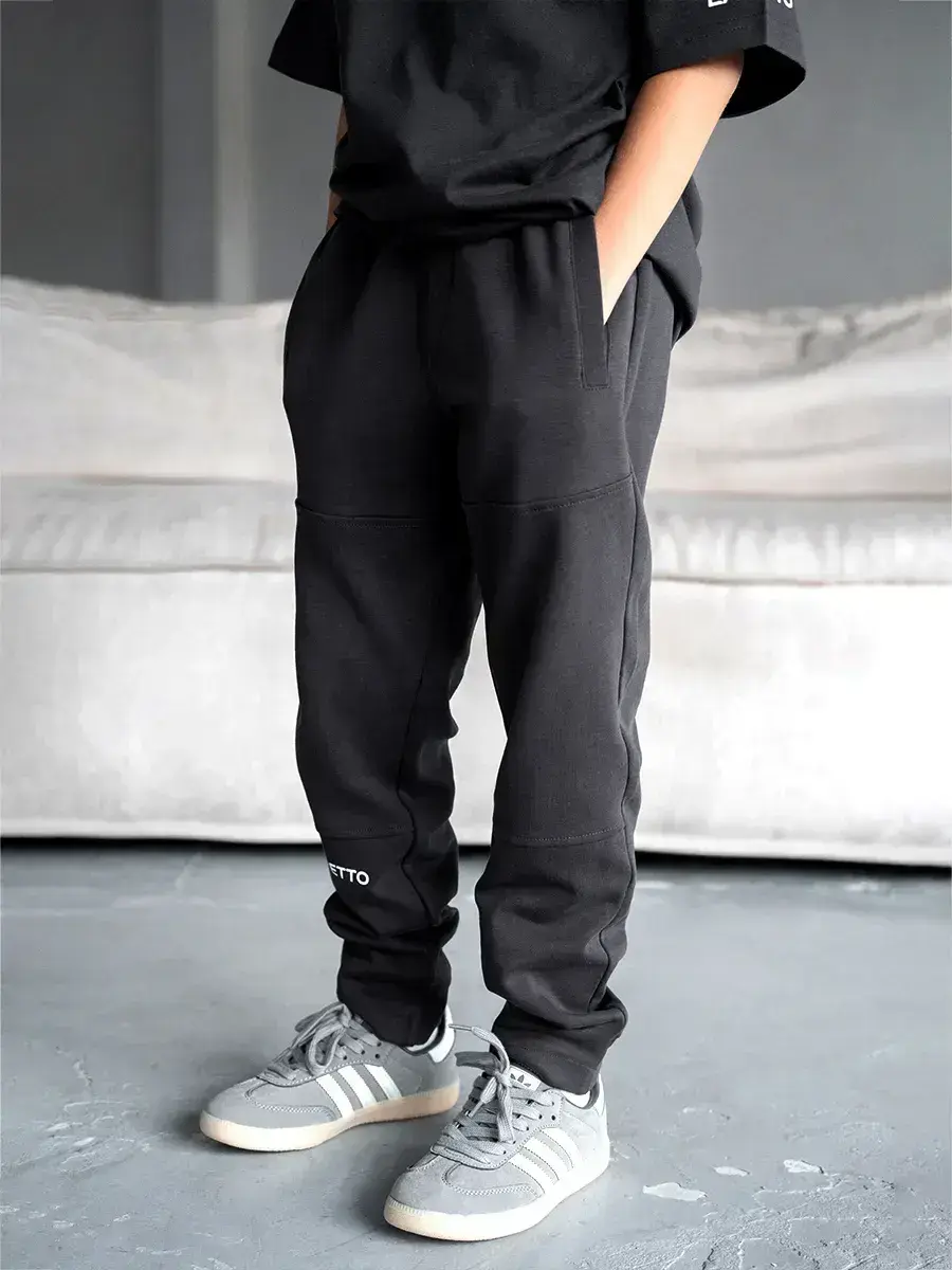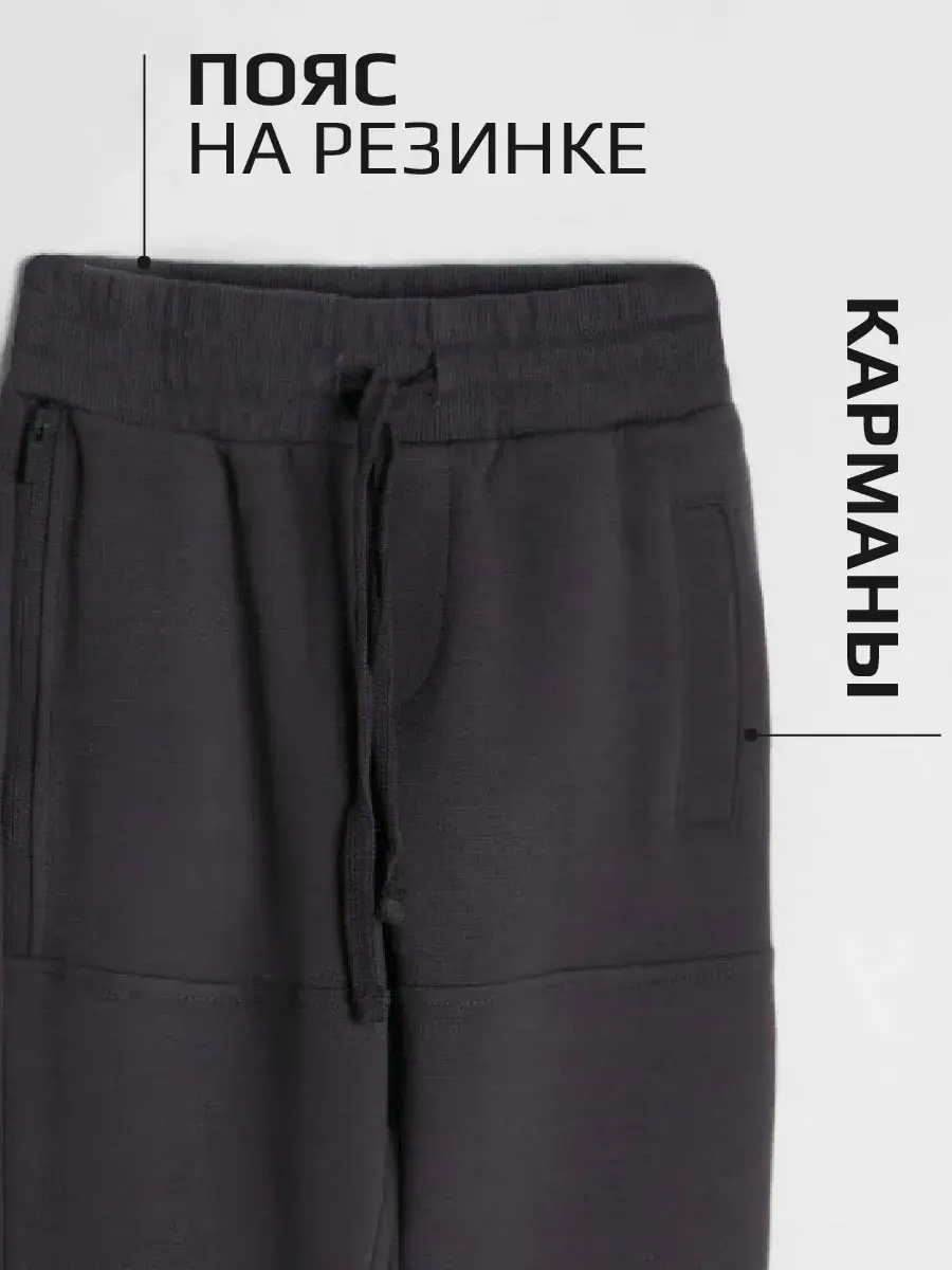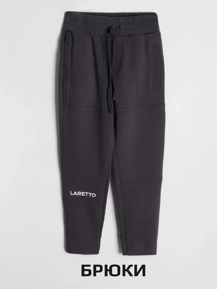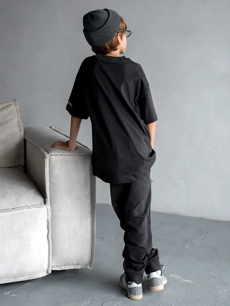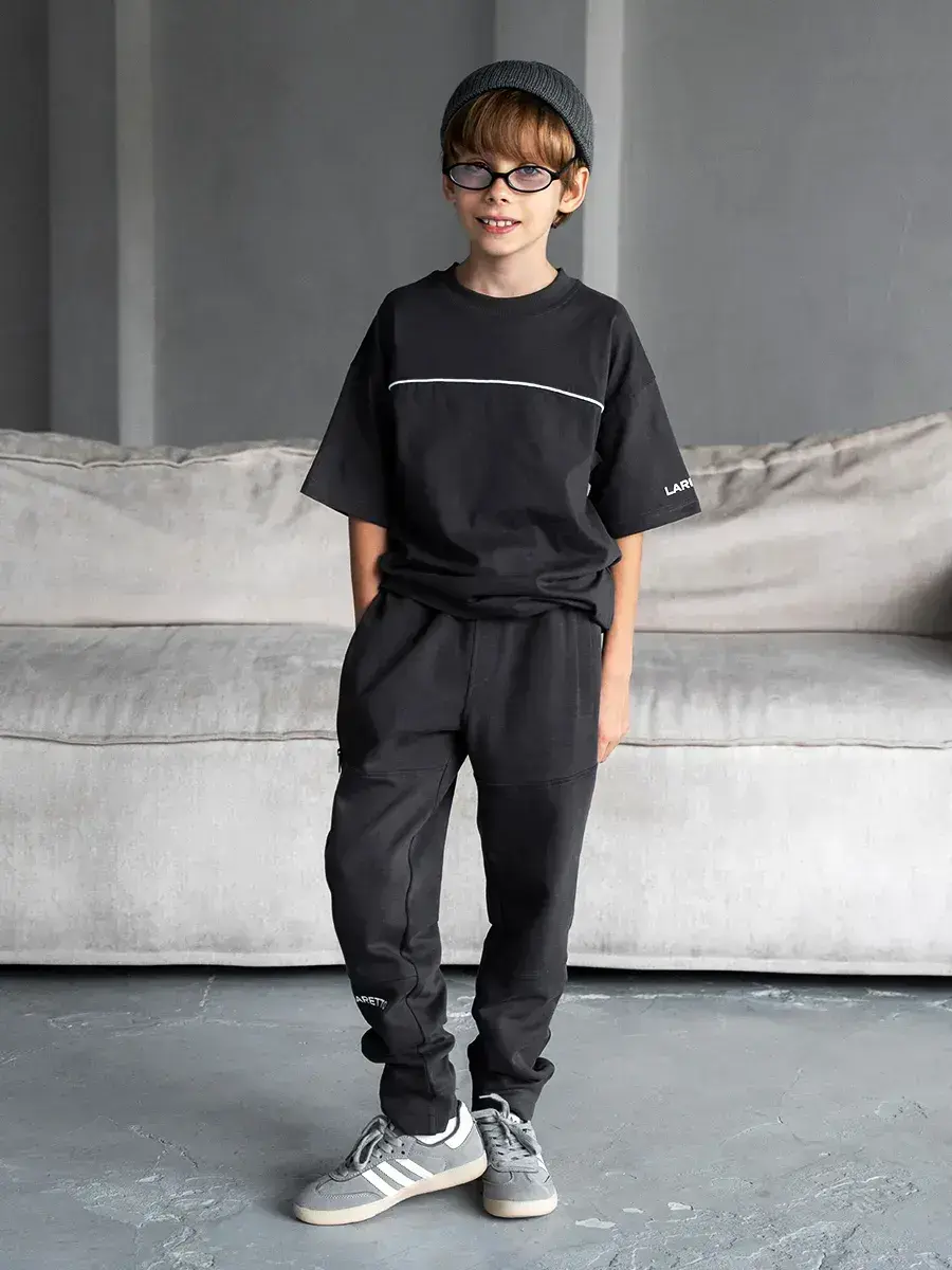 Штаны для мальчика выполнены из трикотажной ткани на основе натурального хлопка. Широкий пояс на резинке не сдавливает талию, а удобный крой обеспечивает комфорт и свободу движений. Зауженный фасон делает образ современным и соответствует актуальным модным тенденциям.