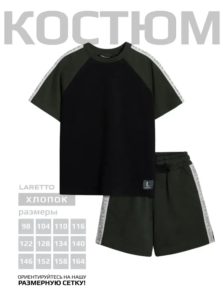 Детский летний костюм для мальчиков – незаменимая вещь в гардеробе ребенка. Комплект включает в себя стильную футболку и удобные шорты на завязках, выполненные из высококачественного трикотажа. Футболку можно комбинировать с любым низом, как и шорты с любым верхом. Дети большую часть времени проводят активно, и для комфортных движений необходимо, чтобы одежда сочетала в себе такие качества, как: свободу, легкость, удобство. Наш трикотажный костюмчик состоит из хлопка, а это значит, что материал приятен на ощупь, дышит, абсорбирует влагу, а также не вызывает аллергических реакций. Ткань костюма держит форму, не подвержена к образованию катышек, почти не мнется и устойчива к многократным стиркам. Футболка с шортами могут служить спортивной формой, и отлично подойдут для занятий физкультурой в школе или для малышей в детском саду, а также для тренировок и спортивных секций. Для Ваших детей мягкость, удобство и максимум комфорта – только с LARETTO. Не упустите возможность порадовать своего ребенка удобным и стильным комплектом!