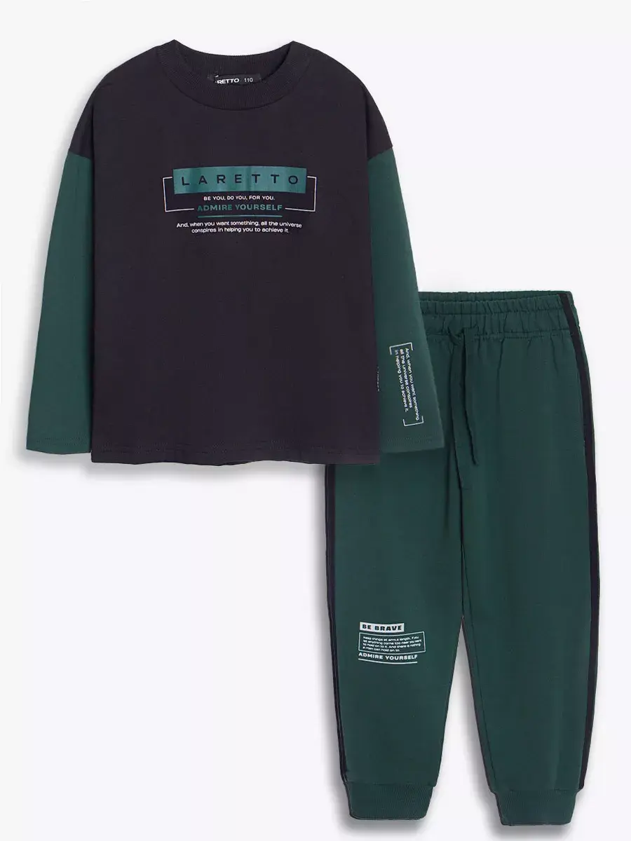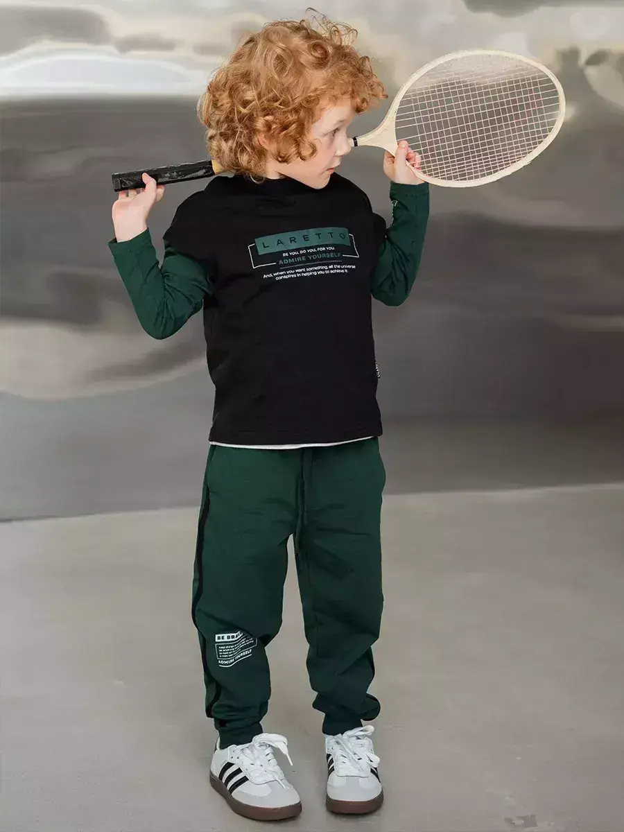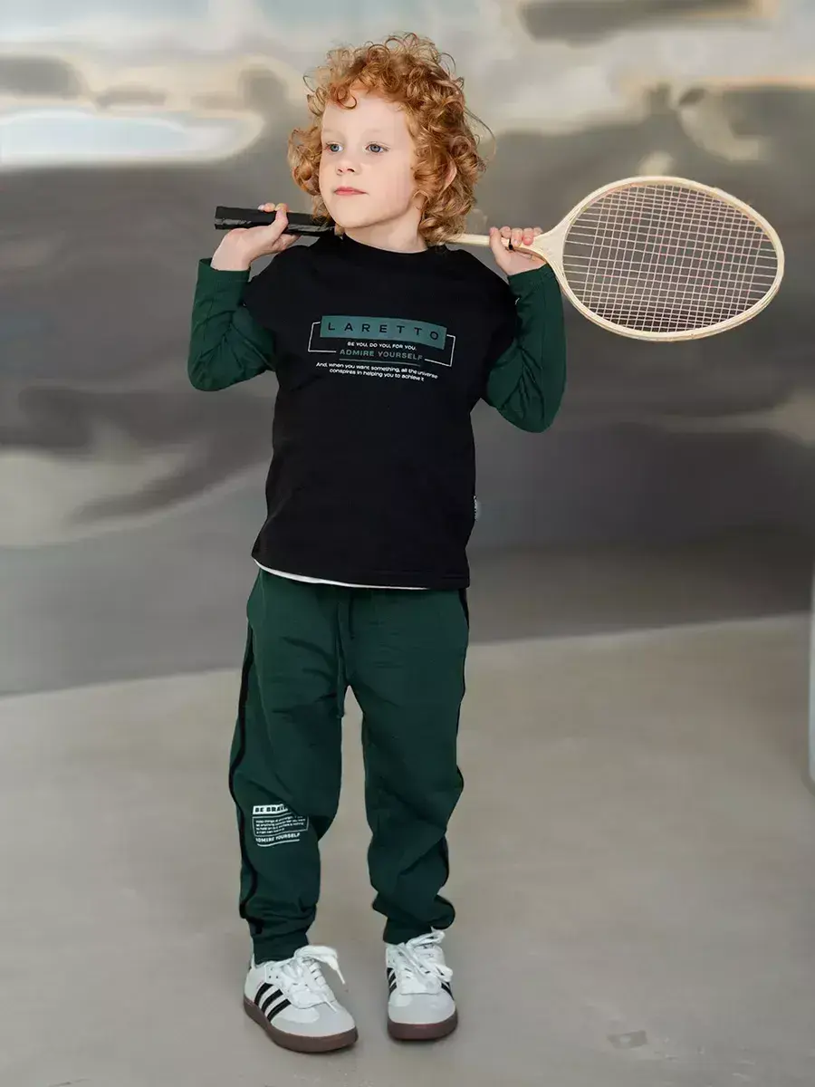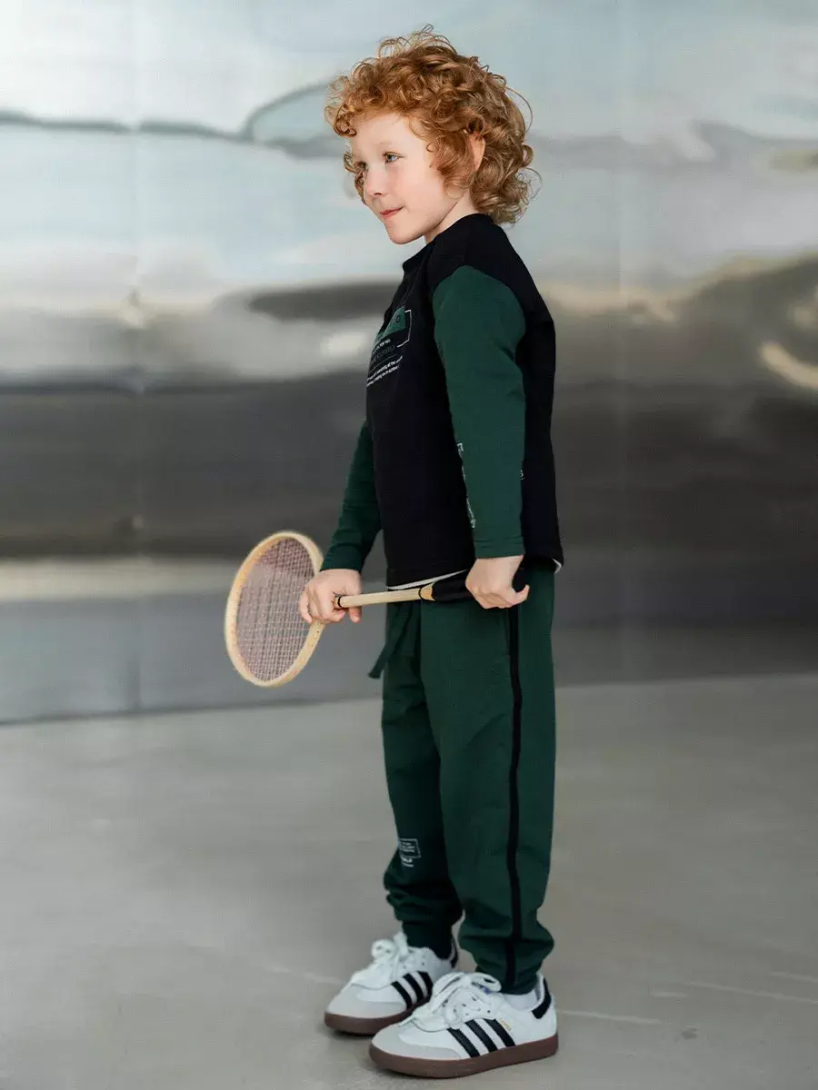 Детские брюки-джоггеры имеют эластичный пояс, что обеспечивает идеальную посадку и комфорт в течение всего дня. Их стильный дизайн с манжетами на щиколотках добавляет современный акцент в образ вашего мальчика. Костюм для мальчика доступен в различных цветах и размерах, что позволяет выбрать идеальный вариант для любого юного спортсмена.