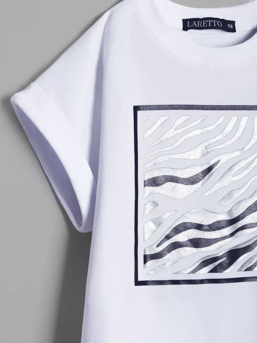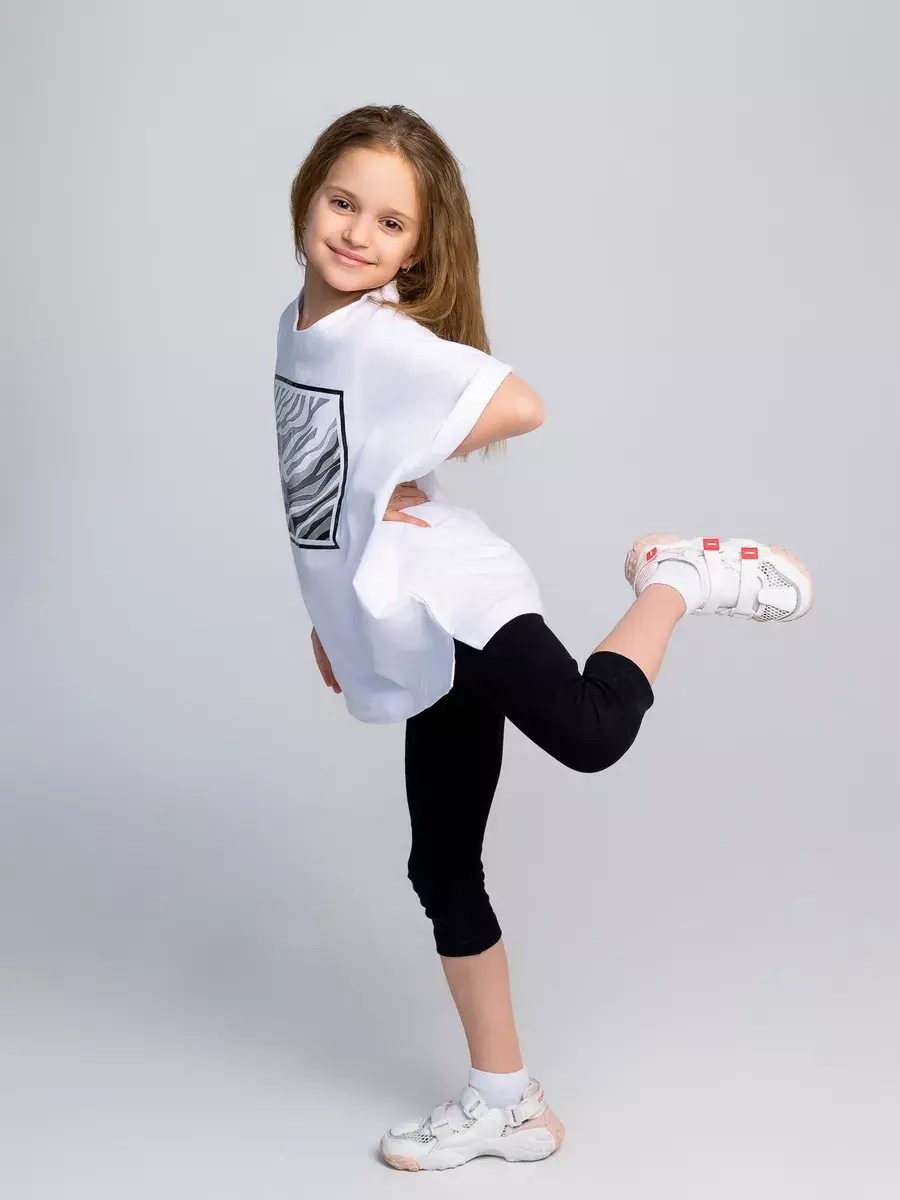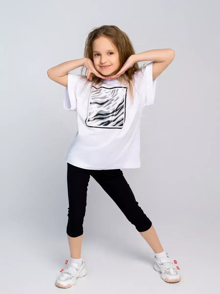 Костюм для девочки, состоящий из футболки и бридж в рубчик. Этот универсальный детский комплект идеально подходит как для малышей, так и для подростков, обеспечивая комфорт и свободу движений в любое время года. Футболка для девочки выполнена из мягкого трикотажного материала, который дышит и приятно ощущается на коже, а велосипедки в рубчик обеспечивают отличную посадку и поддержку.