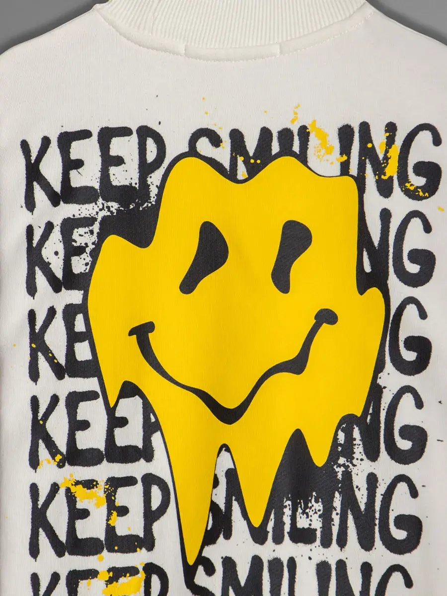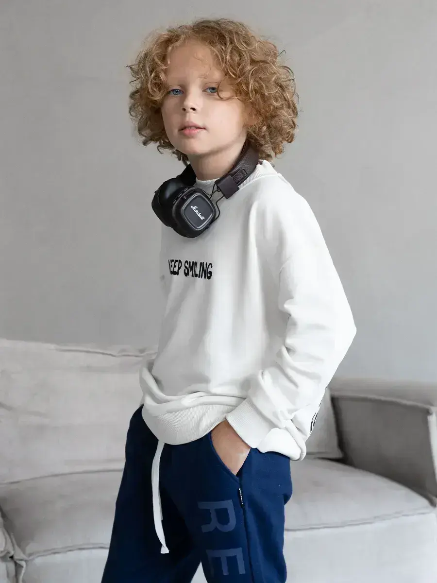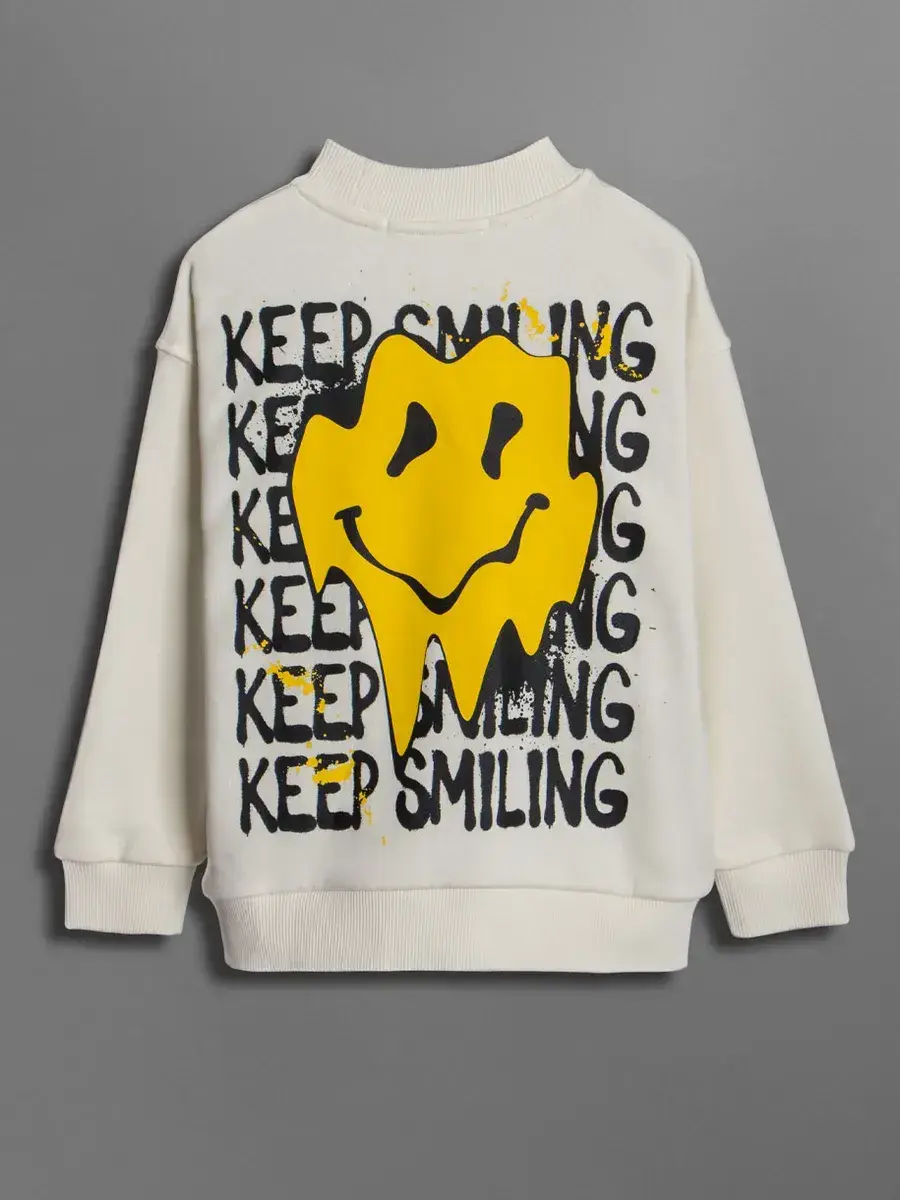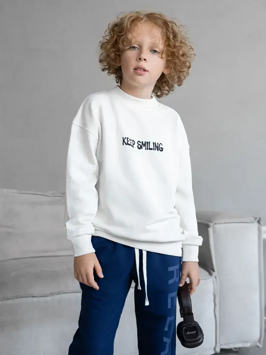 Этот свитшот для мальчика дополнен оригинальным принтом в виде смайлика, который добавляет образу яркость и настроение. Универсальный дизайн школьного свитшота позволяет легко сочетать его с разными элементами гардероба, делая его отличным выбором для подростков.