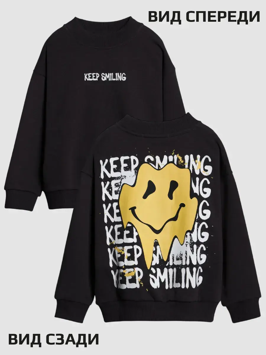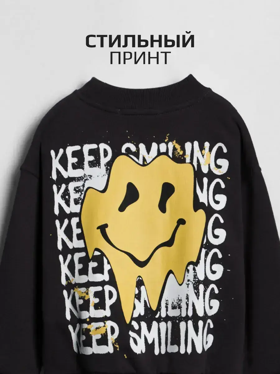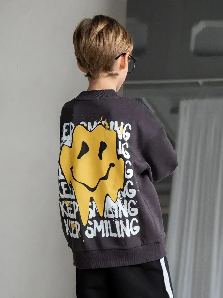 Этот свитшот для мальчика дополнен оригинальным принтом в виде смайлика, который добавляет образу яркость и настроение. Универсальный дизайн школьного свитшота позволяет легко сочетать его с разными элементами гардероба, делая его отличным выбором для подростков.