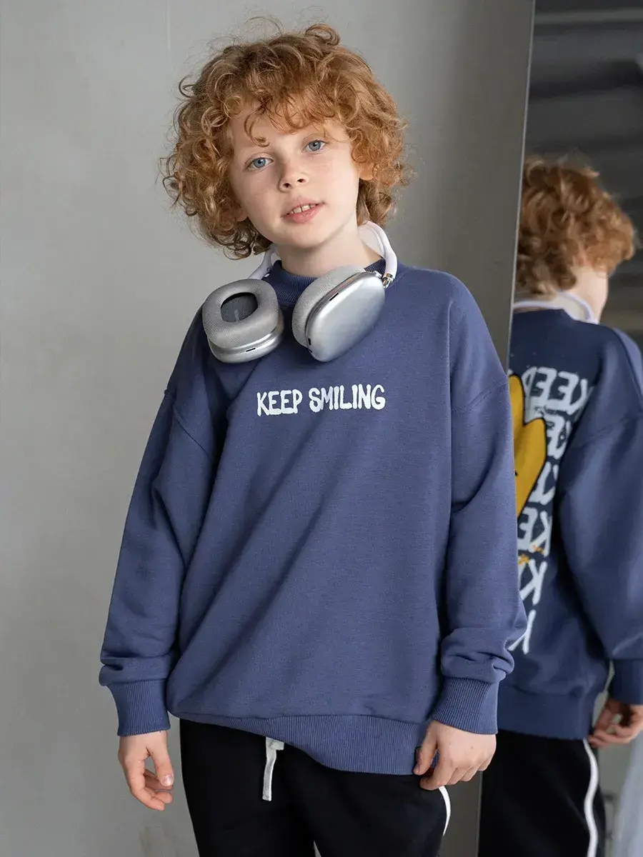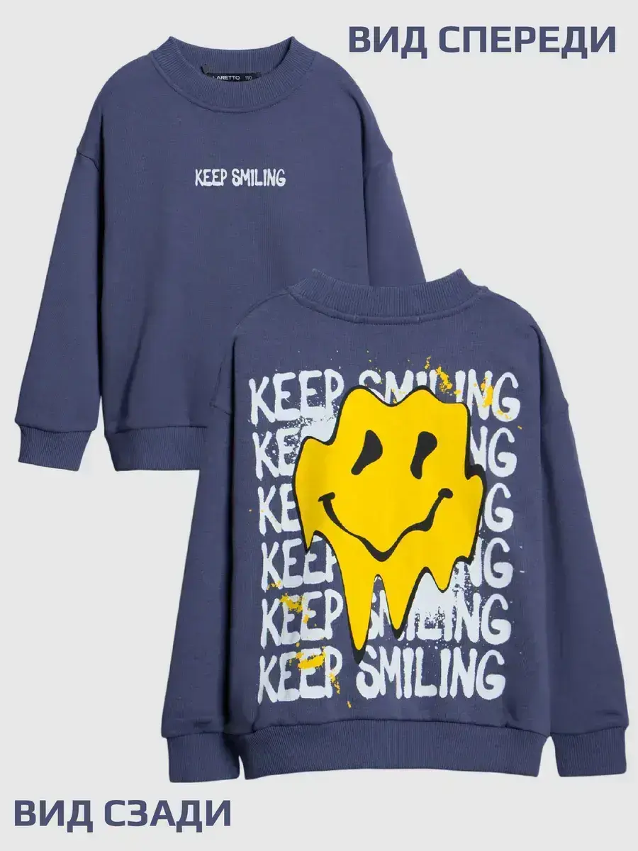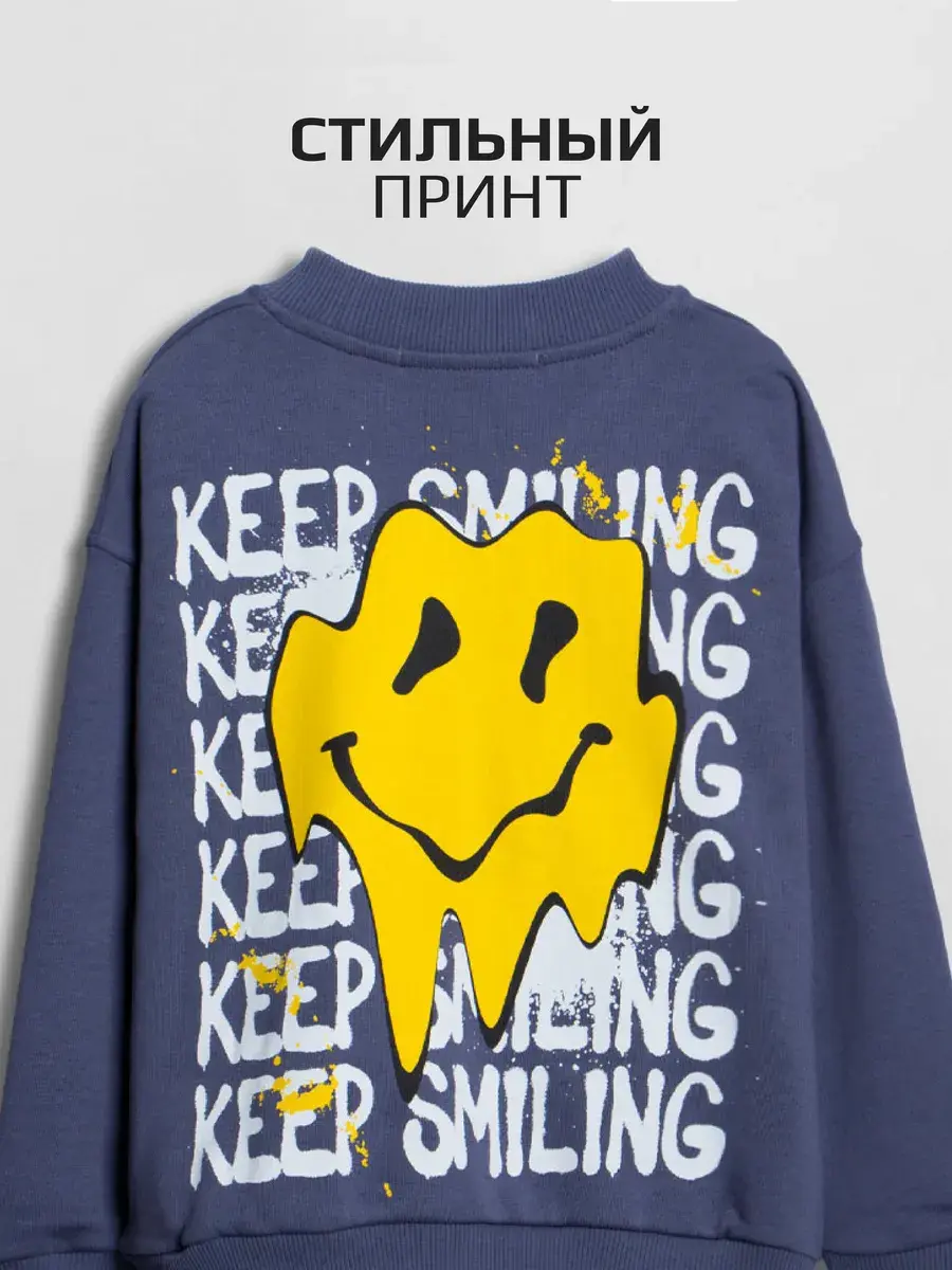 Этот свитшот для мальчика дополнен оригинальным принтом в виде смайлика, который добавляет образу яркость и настроение. Универсальный дизайн школьного свитшота позволяет легко сочетать его с разными элементами гардероба, делая его отличным выбором для подростков.
