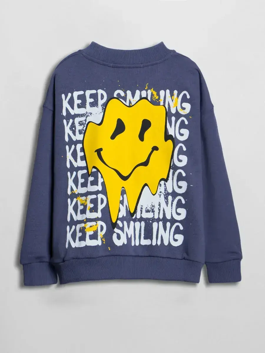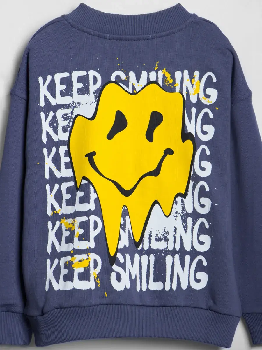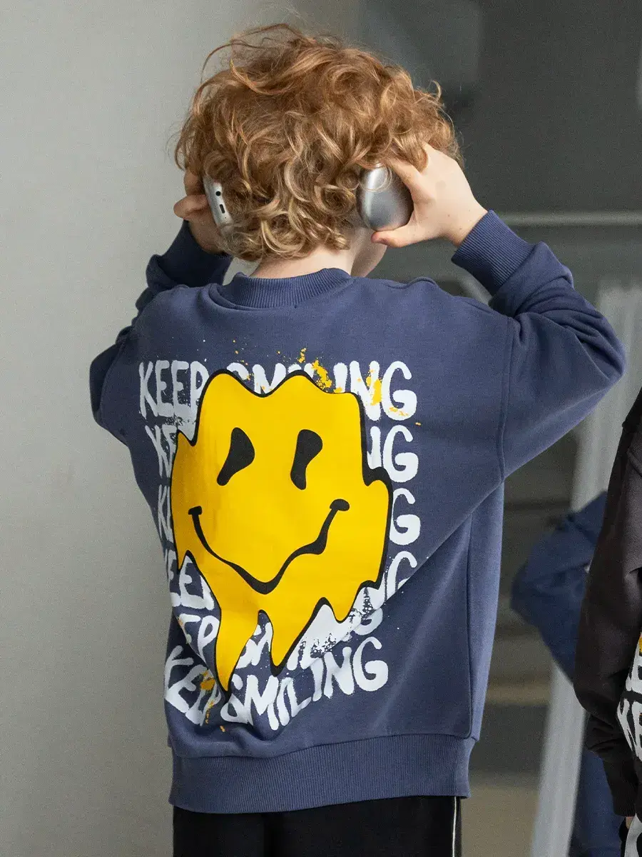 Этот свитшот для мальчика дополнен оригинальным принтом в виде смайлика, который добавляет образу яркость и настроение. Универсальный дизайн школьного свитшота позволяет легко сочетать его с разными элементами гардероба, делая его отличным выбором для подростков.