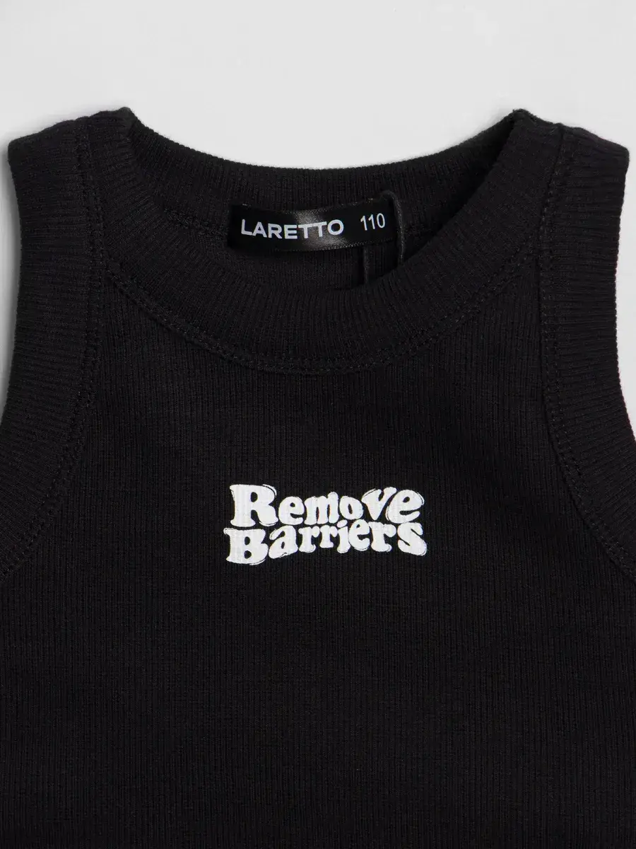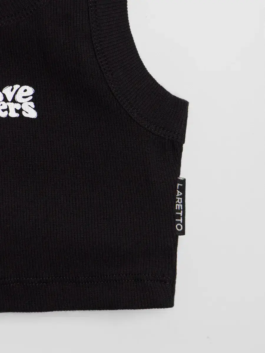 Топ для девочки - идеальный выбор для теплых дней и создания модных повседневных образов. Черный цвет с белой надписью придает майке элегантный вид, подходящий для прогулок, занятий спортом и ношения в детском саду или школе. Удобный крой и мягкая ткань обеспечивают максимальный комфорт даже при активных движениях. Модель с широкими бретелями и круглым вырезом очень комфортна.