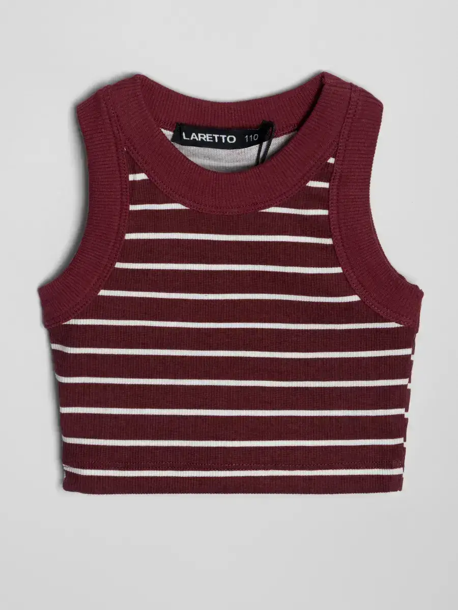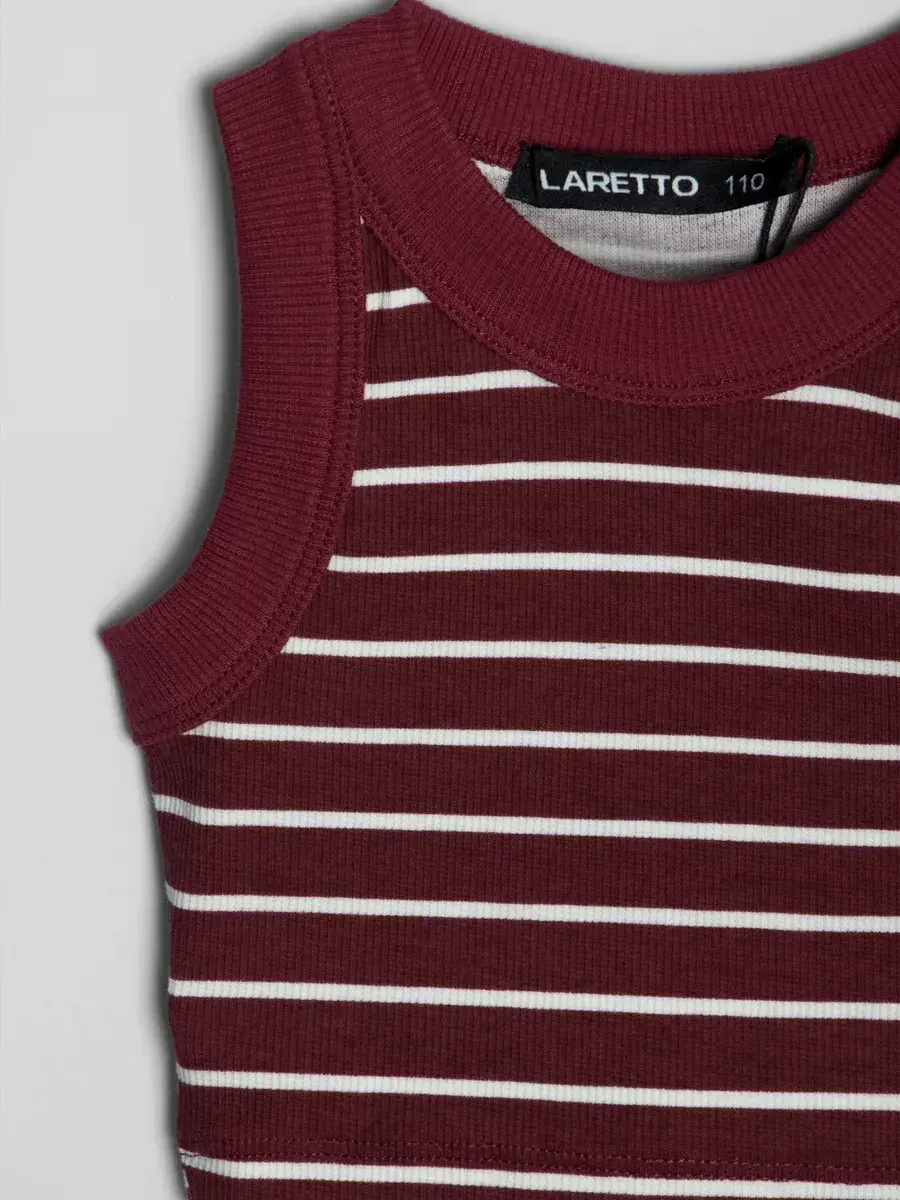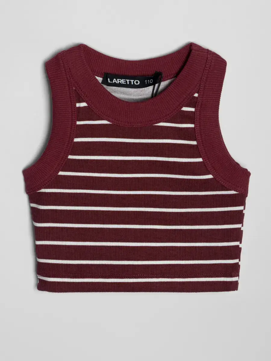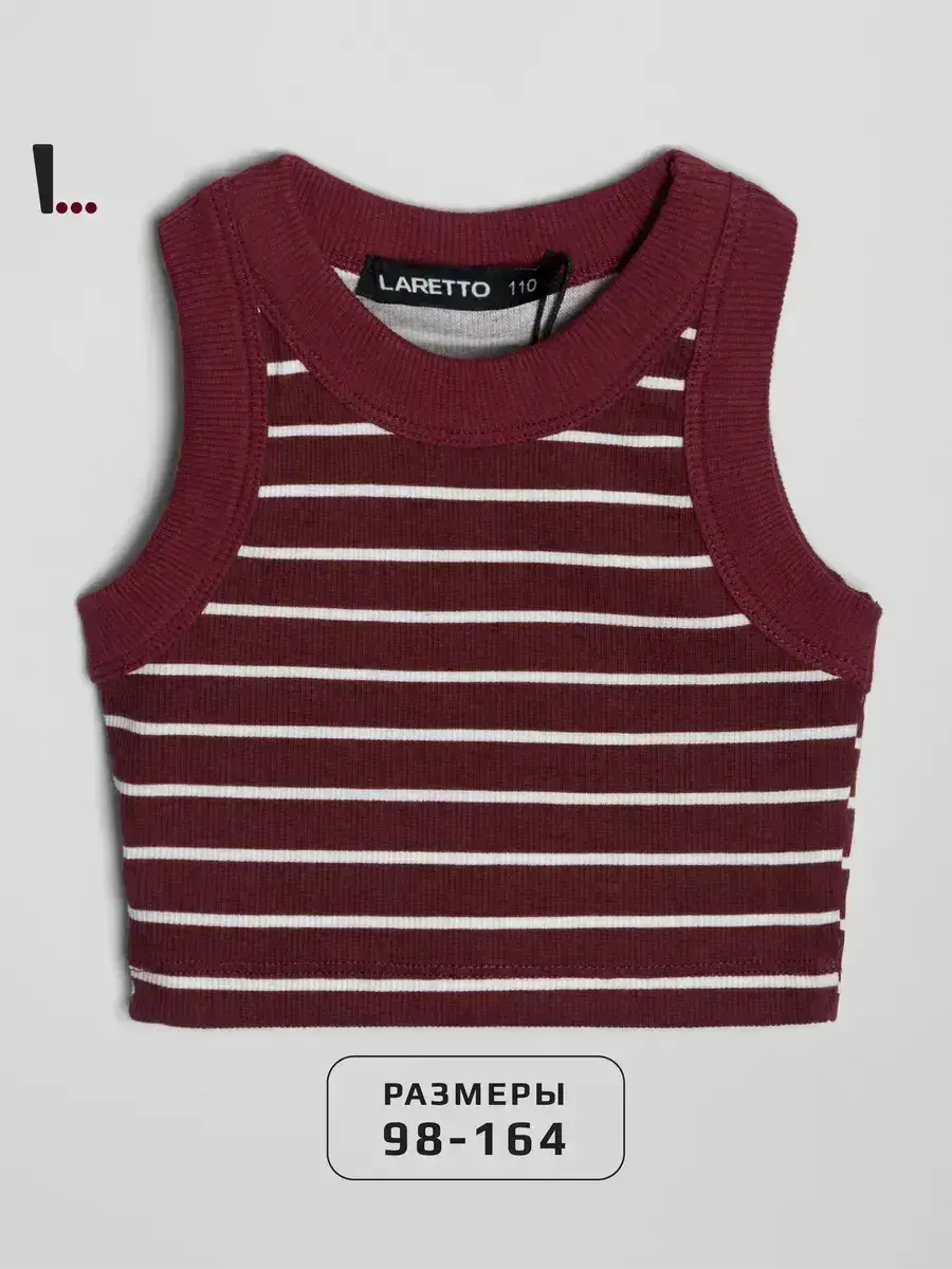 Топ летний для девочки - идеальный выбор для теплых дней и создания модных повседневных образов. Бардовый цвет с тонкими белыми полосками придает майке элегантный вид, подходящий для прогулок, занятий спортом и ношения в детском саду или школе. Удобный крой и мягкая ткань обеспечивают максимальный комфорт даже при активных движениях. Модель с широкими бретелями и круглым вырезом очень комфортна.